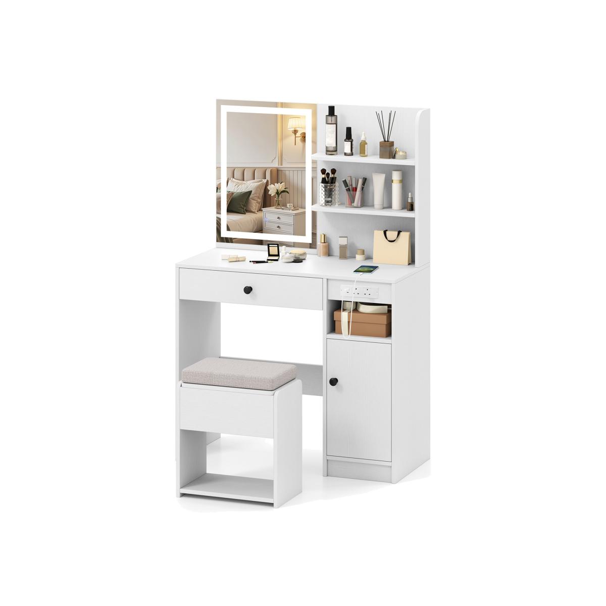 Upgrade your daily makeup ritual with our vanity desk set with mirror and lights. Featuring a mirror with 3 adjustable lighting modes and customizable brightness, this vanity table can enhance your grooming experience. The built-in power outlets streamline your grooming space, ensuring your beauty tools or devices are always ready at your fingertips. The vanity also boasts ample storage solutions. It is equipped with a large drawer, open shelves and a side cabinet with an adjustable shelf, perfect for organizing your cosmetics and accessories efficiently.
