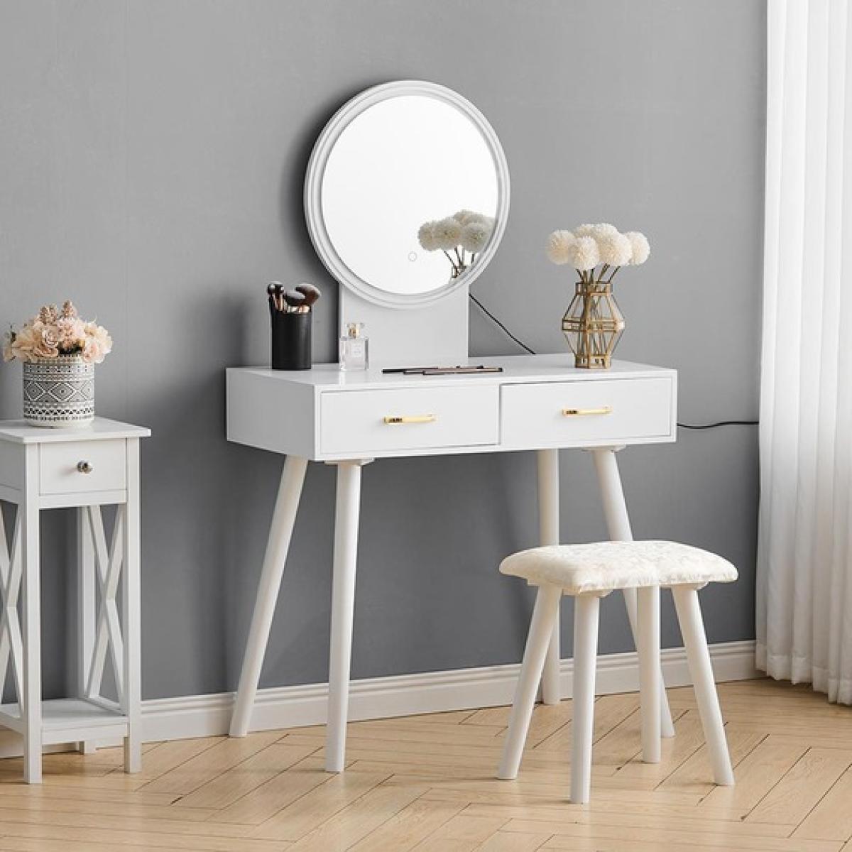 Vanity Dressing Table Stool Set With LED Light Makeup Mirror 2 Drawers White - White