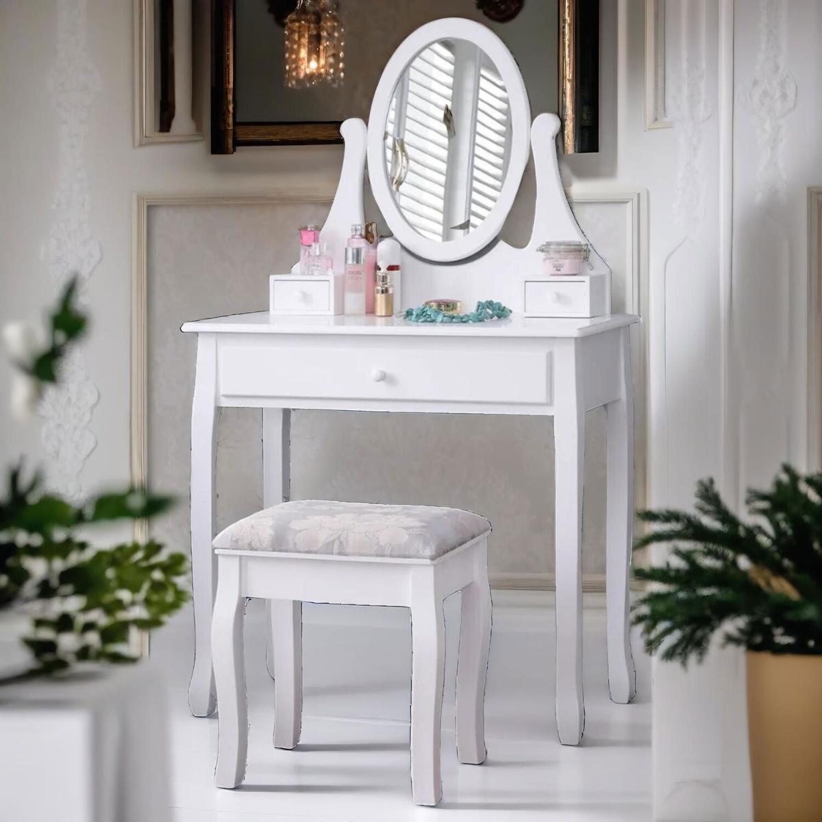 Crafted from high-quality wood and finished with exquisite painting, this vanity table exudes durability and elegance. Featuring three drawers and a generous storage shelf, this vanity provides ample space to organize and store all your beauty essentials conveniently. The storage box and mirror can be easily removed, transforming the vanity into a versatile desk or writing table as needed, offering flexibility in usage. Designed with a sleek white coating, this vanity table enhances the aesthetic of any girls' or women's room, combining style with practicality. Assembly is quick and straightforward, requiring only the attachment of table legs and mirror, ensuring a hassle-free setup process.