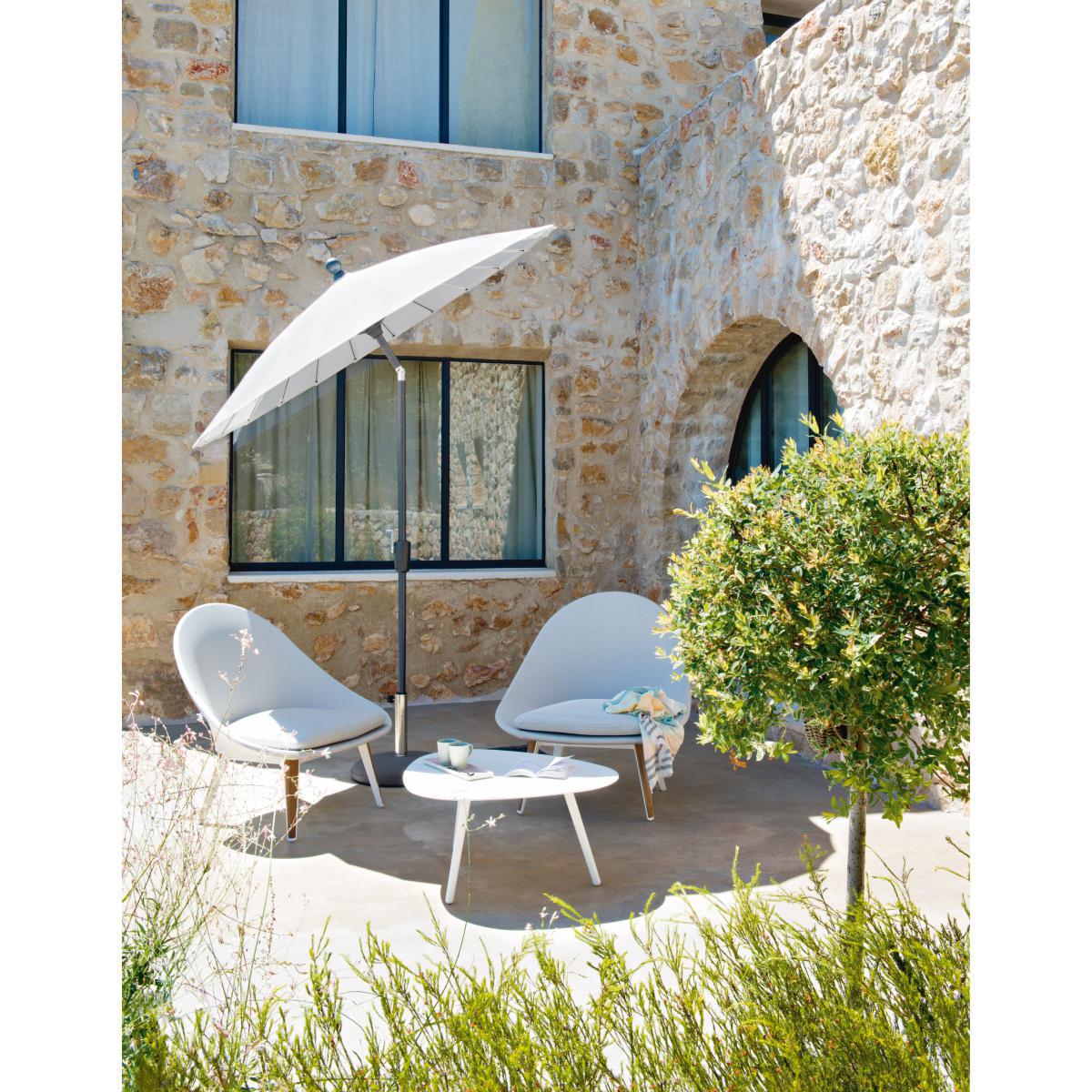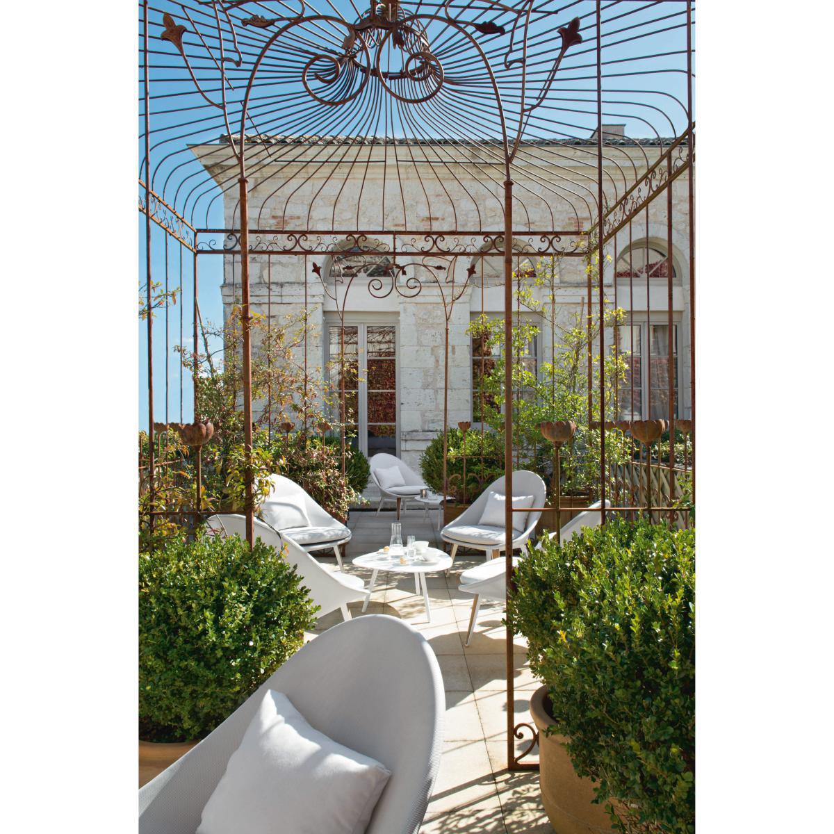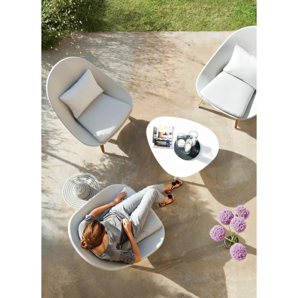 Low armchair, lacquered aluminiumframe. Teak inlaid legs. Sling Cover. Removable seat cushion.