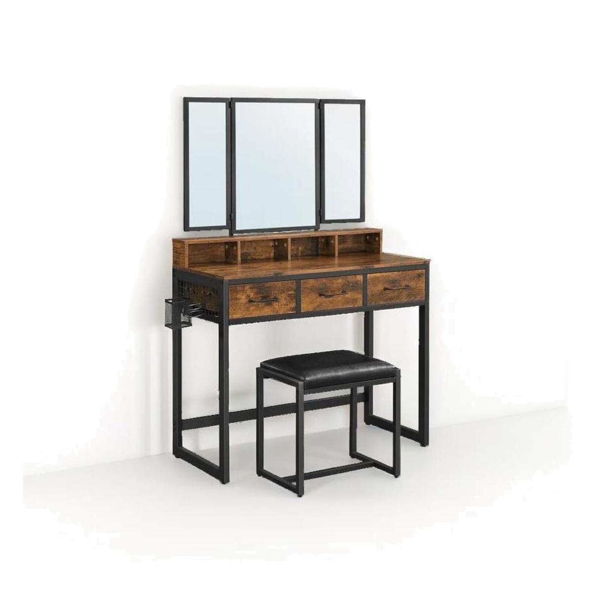 Transform your morning routine with our stylish and functional vanity table complete with a tri-fold mirror, designed to elevate your beauty space. Discover ultimate organization with ample storage including 1 raised shelf for perfumes, 4 open compartments for lipsticks, 3 drawers for palettes and hair tools, and a spacious tabletop to neatly arrange all your beauty essentials. Enhance your grooming experience with a tri-fold mirror that allows a clear view from multiple angles, perfect for adjusting side panels to effortlessly perfect your makeup and hairstyling. Effortlessly organize jewellery and accessories with hooks behind the mirror for earrings, bracelets, and necklaces, while a dedicated holder ensures your hair dryer and brushes are always within reach..