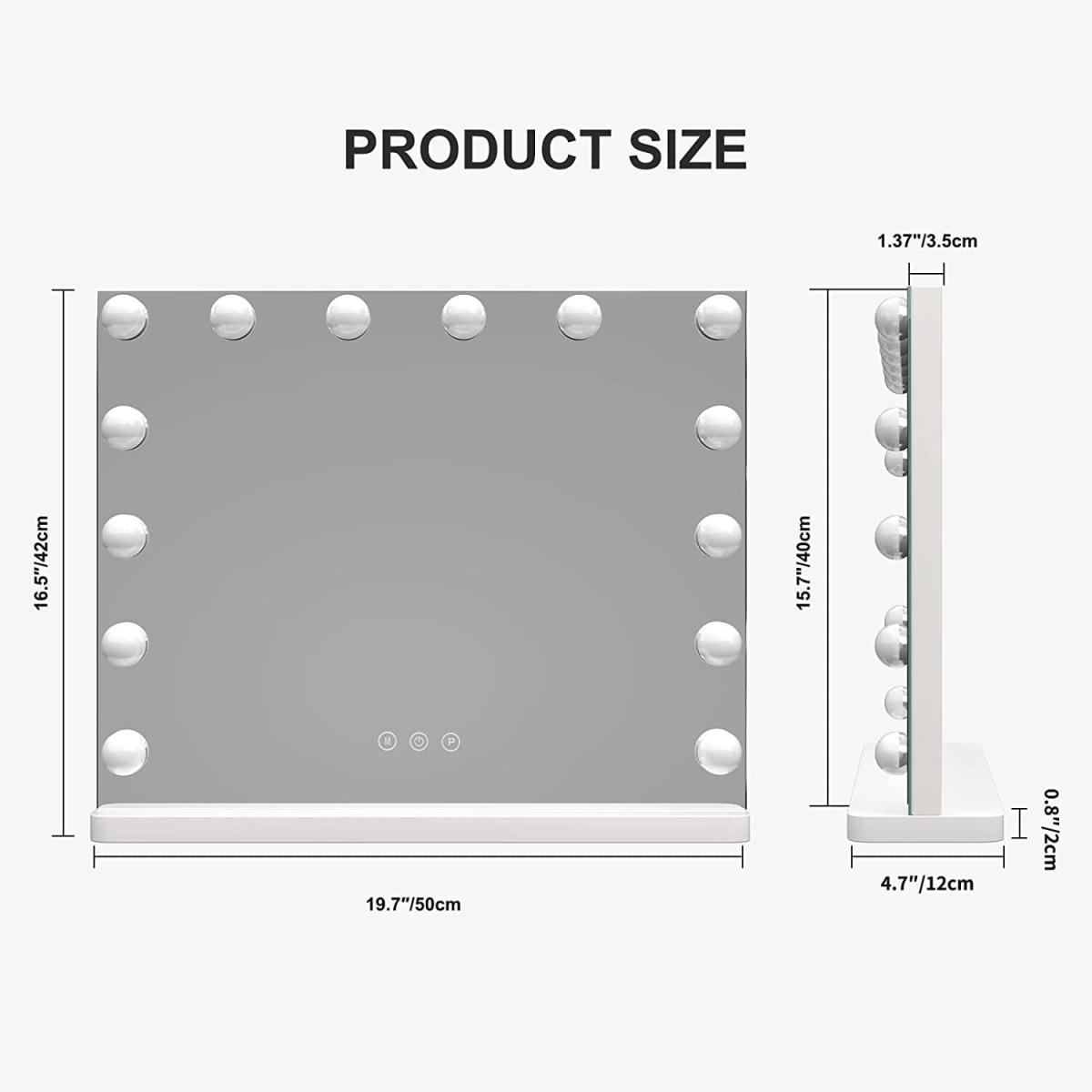 The lighted vanity mirror has a perfect size of 50x 10x 42, which is large enough to show whether your makeup, hairstyle, jewellery, and clothes match. A detachable 10 times magnifying point lens is suitable for you to apply delicate eye makeup. The Hollywood makeup mirror is surrounded by 14 LED bulbs, free to switch between warm light, natural and cold light. It is no longer limited to the traditional fixed brightness, it can be individually adjusted to your comfortable brightness, suitable in any environment, you can get the most natural makeup effect even at night. The middle button is used to turn on and off, the "M" button is used to change the colour of light, and the "P" button is used to adjust the brightness. The memory function can keep your lighting settings as your last use, really convenient to use. The makeup mirror feature with sturdy metal base and 2 hanging holes, it can be used as a dressing tabletop mirror to stand freely on the desk or used as wall mounted mirror to save space. This lighted cosmetic mirror is not only a mirror, but also your beautiful decoration of the dressing room and the bedroom. If you received a defective product, please do not hesitate to contact us to solve the issue for you.