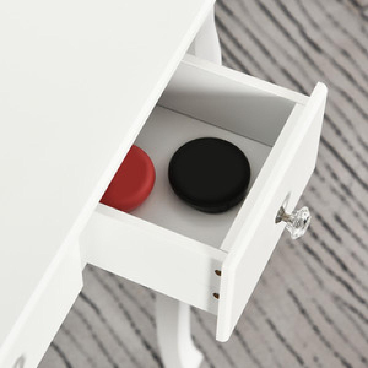 I love this dressing table set for its clean, classic look that can suit a variety of interiors, from vintage-inspired to modern minimalist schemes. Its white finish makes it versatile and easy to style, complementing both neutral palettes and pastel accents. The five drawers offer practical storage for everyday makeup and accessories, while the cushioned stool keeps things comfortable for daily routines. To style it effectively, consider adding a few personal touches like minimalist organisers, a small plant or scented candle, and a tricky mirror to reflect light and create a fresh, airy feel. This piece works particularly well in bedrooms or dressing rooms that aim for a neat, elegant aesthetic without overwhelming the space.