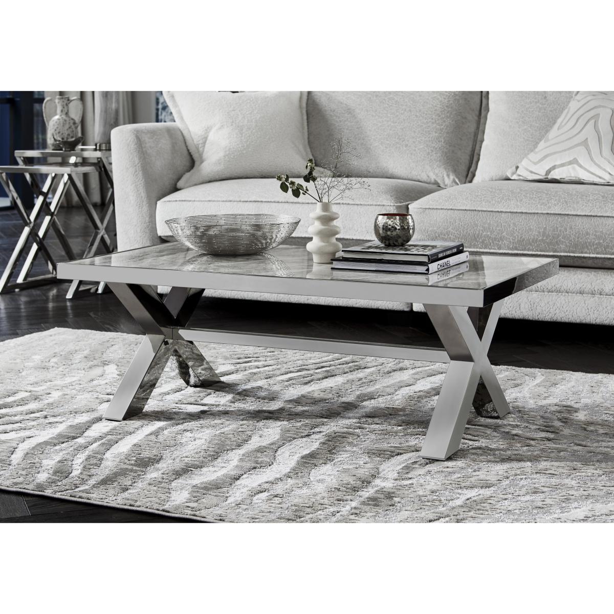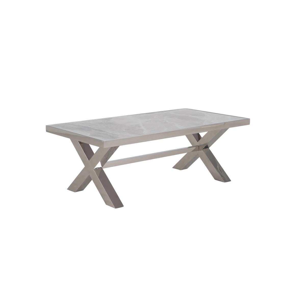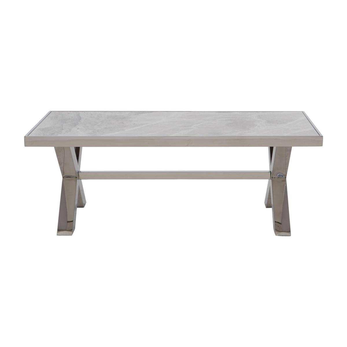 We’ve found you the perfect coffee table. Here, hardwearing ceramic practicality meets glamorous style in the form of a marble-effect finish and that shiny stainless steel frame. Why you'll love it. Statement coffee table exudes high-class glamour. Contemporary luxury style. Marble-effect ceramic top. Stainless steel frame and X-shaped legs. Hardwearing surface is both heat-resistant and scratch-resistant. Exclusively at Furniture Village. What you need to know. This piece is heavy – if moving, keep the top horizontal. Avoid placing in direct sunlight or close to heat. Stainless steel may show light hairline scratches. To protect the surface, please use coasters and placemats. Part of the Vanquish range of gorgeous living and dining furniture.