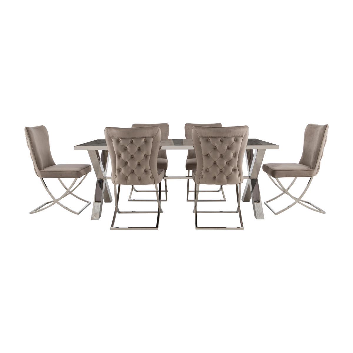 Dine in glam style – even if it’s just you and the family. Seating six, this luxe dining table has a marble-effect ceramic top and stainless steel legs. The set comes with six velvet chairs. Why you'll love it. Statement dining set exudes high-class glamour. Contemporary luxury style. Marble-effect ceramic top. Stainless steel frame and X-shaped legs. Hardwearing surface is both heat-resistant and scratch-resistant. With 6 dining chairs upholstered in ultra-soft velvet in a choice of colours. Chairs have curved stainless legs, deep cushioning and beautiful buttoning. Exclusively at Furniture Village. What you need to know. Dining table seats 6. Table is heavy – if moving, keep the top horizontal. Avoid placing in direct sunlight or close to heat. Stainless steel may show light hairline scratches. To protect the surface, please use coasters and placemats. Part of the Vanquish range of gorgeous living and dining furniture.