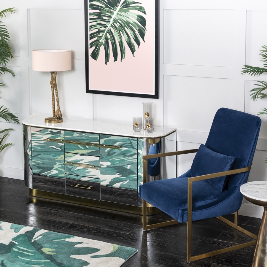I love this chair for its sophisticated navy hue and the touch of luxury added by the brushed gold base. It works particularly well in modern or contemporary interiors, adding a pop of colour without overwhelming the space. The clean lines and plush upholstery make it a versatile statement piece - perfect in a living room corner, home office, or even a bedroom reading nook. To style it effectively, pair it with textured cushions or a throw in complementary colours like soft greys or metallics for added depth. Its striking yet understated aesthetic makes it a practical choice for creating focal points while maintaining a polished look.