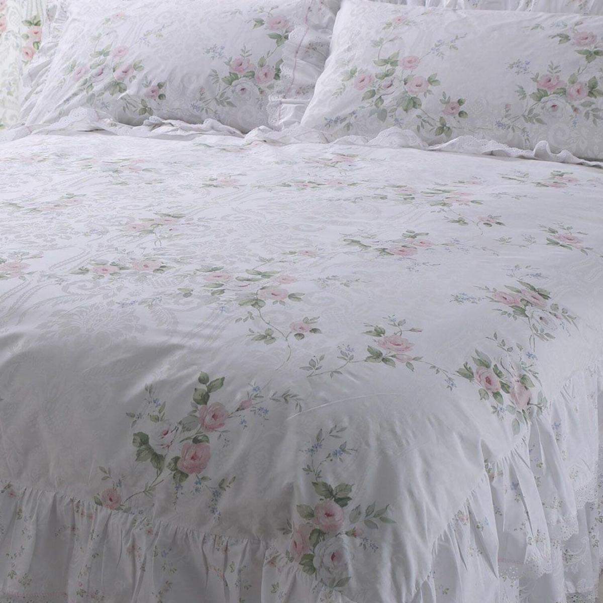 This Country Collection showcases beautifully drawn florals, pretty frills and lace trims adding a touch of romantic country charm to any home. An elegant floral trail design on a damask print background with frills trimmed with lace and satin piping.