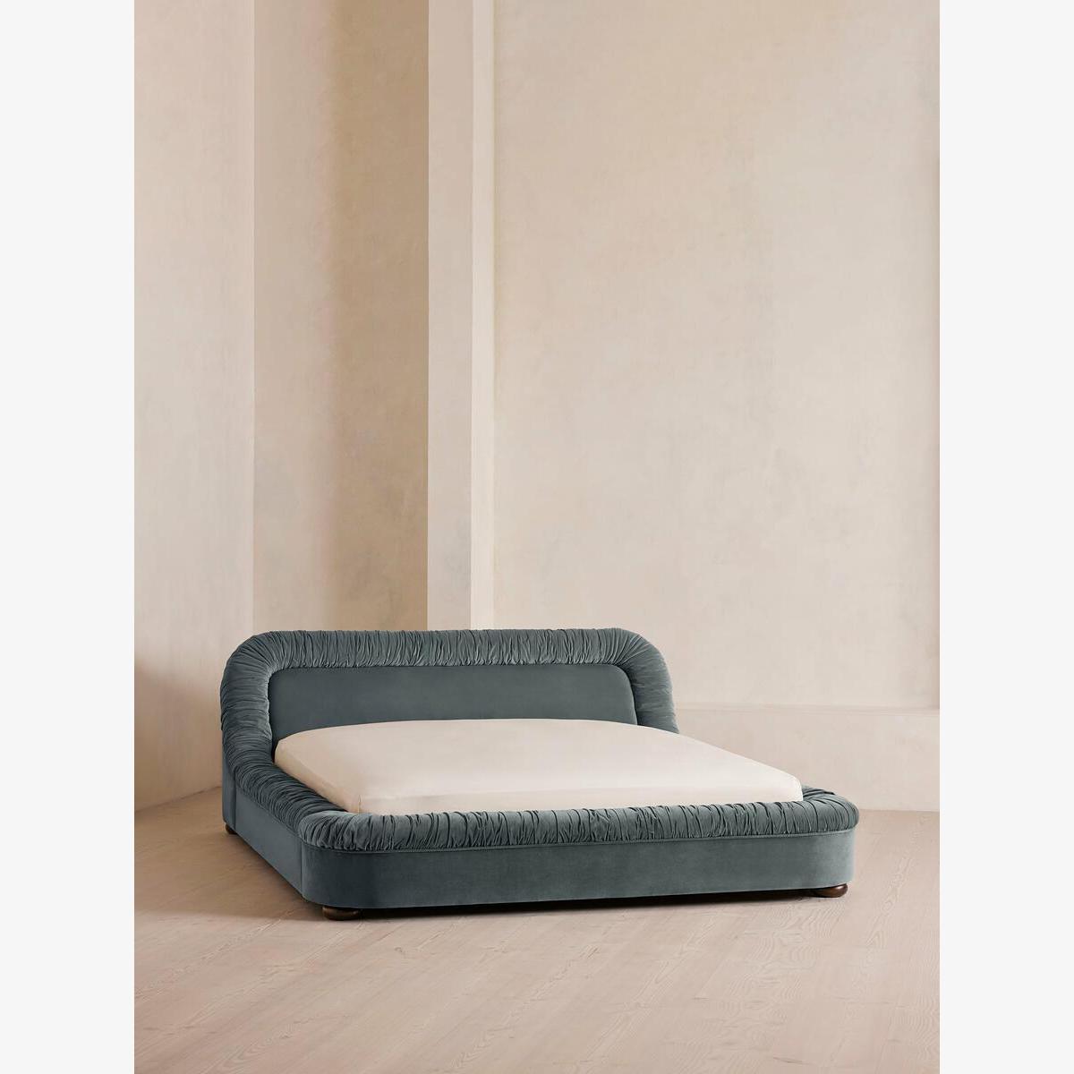 Finished with a low, cushioned headboard, the Vara bed's curved silhouette is made to mirror the aesthetic of Soho House Rome. It showcases a mix of upholstery techniques, including a textural, ruched border that wraps around the frame.