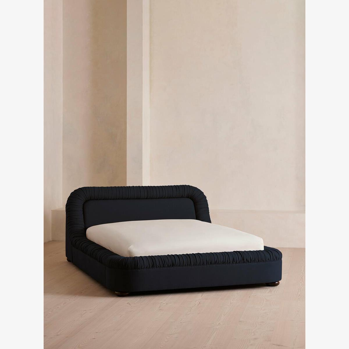 I love the Vara bed for its deep indigo linen upholstery and softly rounded frame - it makes a strong yet unfussy focal point. Its low profile and tactile pleating work equally well in minimalist Scandi schemes or a relaxed coastal look. For styling, layer neutral bedding in off-whites or soft greys to let the colour stand out, then balance the depth with light timber side tables and a woollen throw. A pair of simple brass lamps or a woven basket beside the bed adds warmth and texture without cluttering the space.