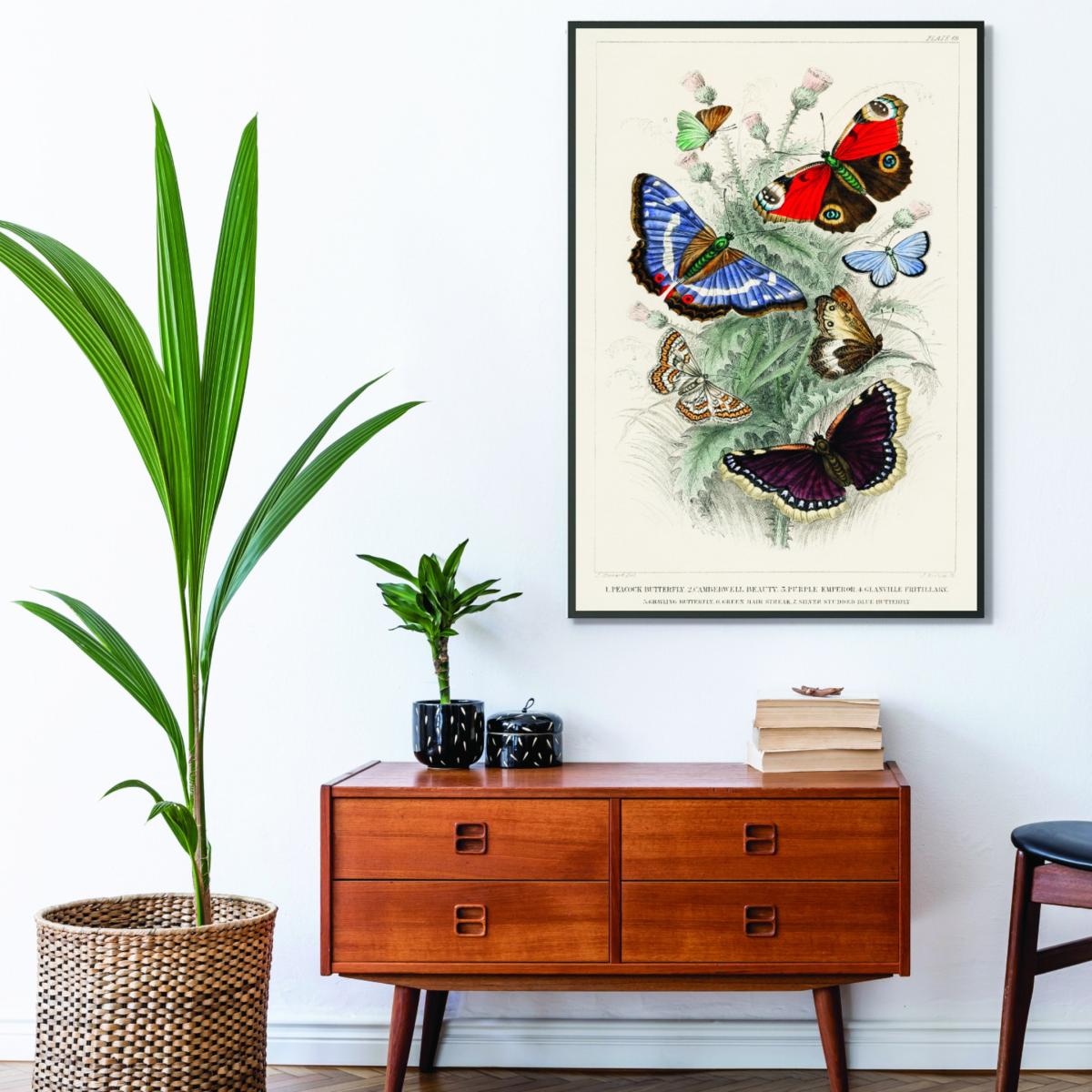 I really love the variety and colour in the butterfly print, making it a versatile piece that can add a lively focal point to many interiors. This print works particularly well in eclectic, botanical, or nature-inspired spaces, complementing natural textures and neutral palettes. For styling, consider grouping it with other nature-themed artworks or placing it above a simple sideboard or console to anchor a wall. It’s also a great option for adding visual interest in areas like a hallway, living room, or even a bedroom, where it can bring a splash of colour and an element of curiosity. To keep it looking fresh, pair it with minimal accessories and let the artwork do the talking.