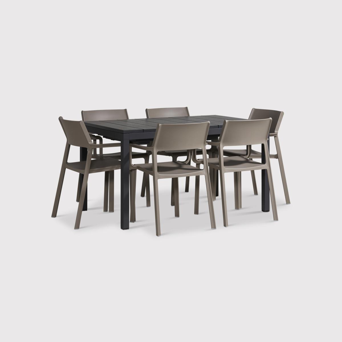 The Varuna Table with 6 Calisto Chairs will enable you to dine in style in your garden with family and friends. Featuring an extendable table with architectural details and chairs that are ergonomically designed with supportive armrests, perfect for you to enjoy comfort whilst relaxing. The set is both durable and low maintenance, so not only is it a sophisticated garden set to look at but sturdy and robust to lastnbsp;for many years to come.nbsp;Crafted from 100% recyclablenbsp;plastic it is a sustainable choice too.nbsp