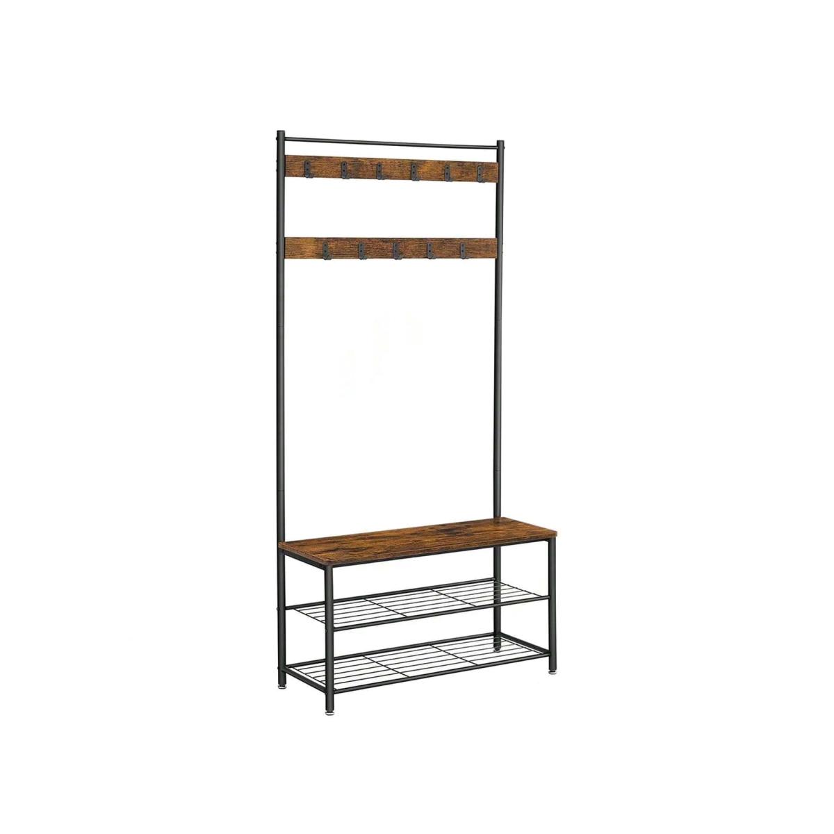 This 3-in-1 coat rack features coat hooks, a shoe bench, and a shoe rack, making it an all-in-one multipurpose hallway storage unit that meets your needs for hanging clothes, organising shoes, and sitting down to put on or take off your shoes. With 9 rust-resistant metal hooks in 2 rows, each holding up to 3 kg, it offers ample hanging space for coats, bags, hats, and scarves. Supported by a sturdy steel frame and levelled by 4 adjustable feet, it provides stable support, while the shoe bench has a weight capacity of 90 kg and can also serve as a storage shelf. Easy to assemble with clear instructions.