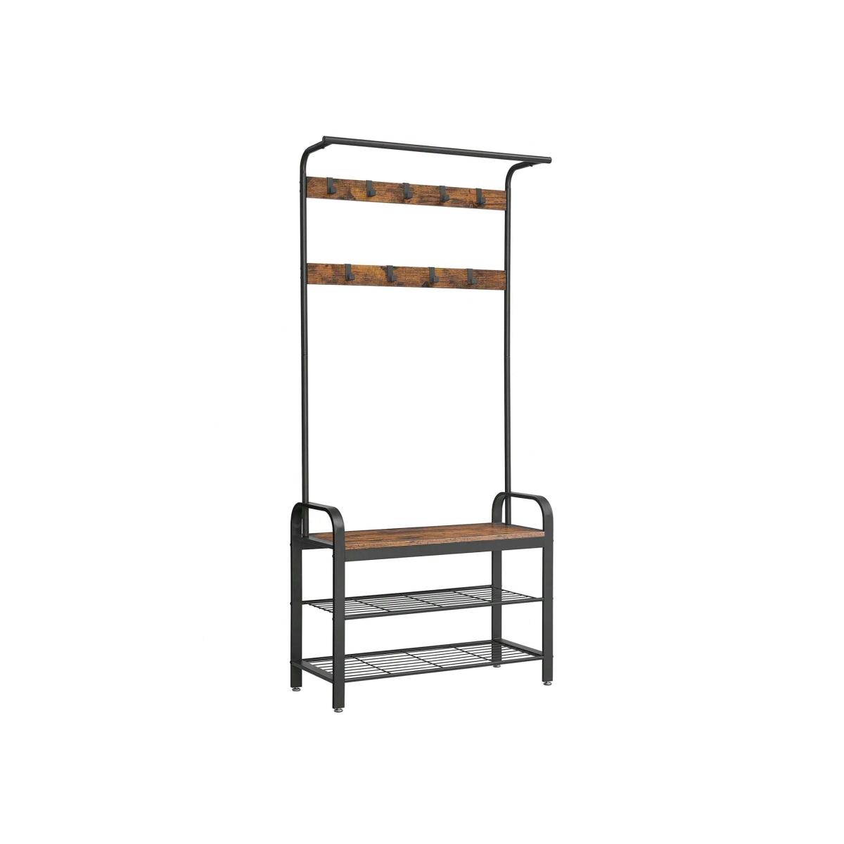 This 4-in-1 coat rack combines a hanging rail, shoe bench, shoe rack, and coat hooks to meet various needs, from hanging clothes to organising shoes and providing a comfortable seat for changing shoes. The practical hanging rail maximises vertical space, allowing for scarves, umbrellas, and additional clothes hangers. With 9 quality, removable hooks made of robust, rust-resistant metal, it accommodates items of different sizes. The sturdy steel frame, 3.8 cm wide legs, and quality particleboard ensure stability, supporting up to 90 kg for safe seating, while the anti-tip kit enhances overall stability. Assembly is straightforward with numbered parts and clear instructions.