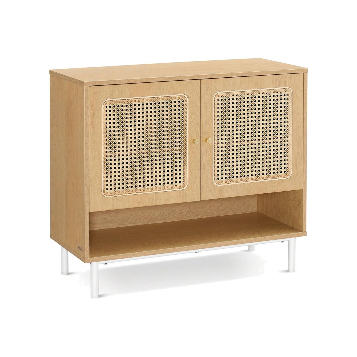 This shoe cabinet features a rattan-look design that enhances the aesthetic appeal of your entryway while ensuring optimal ventilation. With adjustable inner upper shelf height, it accommodates various shoes, from high heels to boots, and its elevated base allows for easy cleaning. Combining open and closed storage, it efficiently houses 9-12 pairs of shoes along with other daily items, helping to keep your entryway orderly and clean. Constructed from high-quality particleboard, PVC rattan, and steel legs, it offers a sturdy and durable structure capable of supporting up to 75 kg. Its flexible design makes it suitable for the entryway, living room, or dining area.