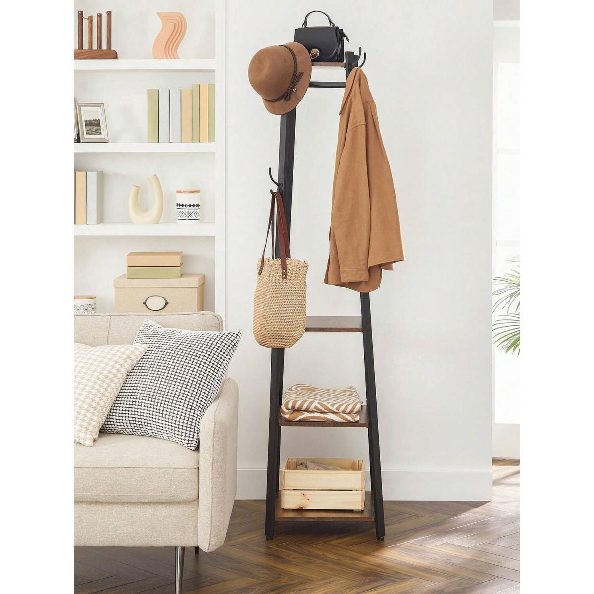 This coat rack features a robust and durable design with a sturdy steel frame and high-quality particleboard, ensuring long-lasting use. It combines various home storage solutions, including double coat hooks for jackets, scarves, bags, or hats, shelves for boxes or small plants, and rails for clothes hangers. The stable construction is enhanced by adjustable feet, making it suitable for slightly uneven floors. Its tapered shape allows for space-saving placement in corners of hallways, bedrooms, living rooms, or offices.