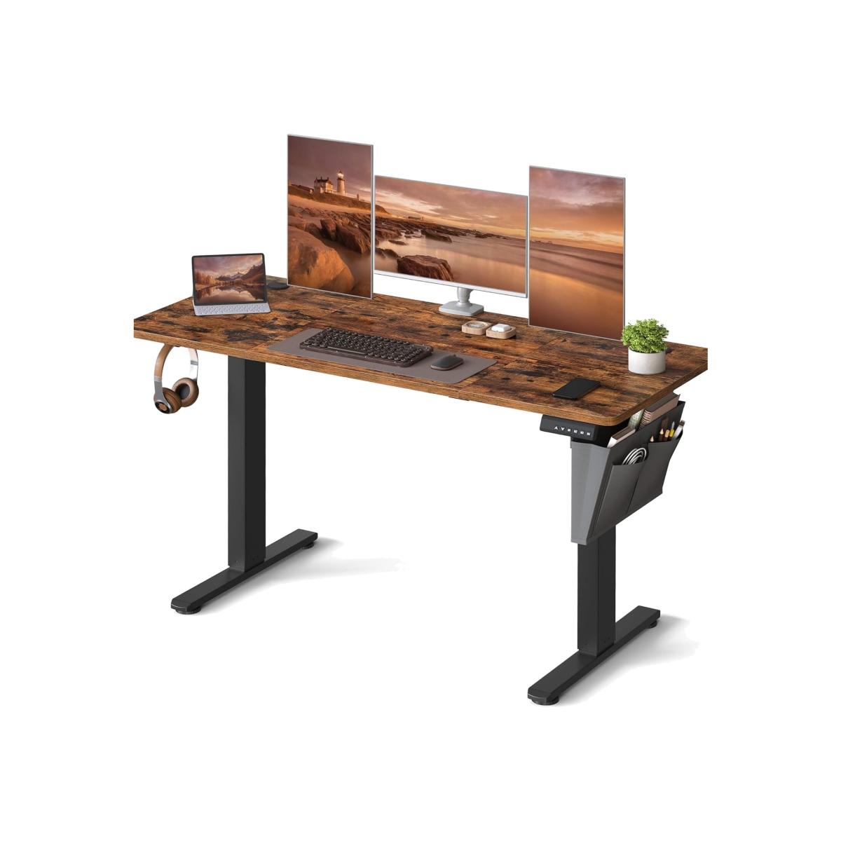 This height adjustable desk features a robust steel frame and particleboard panels, supporting up to 70 kg for a stable workspace. The premium motor ensures smooth height adjustments between 72-120 cm at a noise level below 50 d. B, creating a quiet environment. With the ability to save 4 preferred heights, it offers flexible and safe height adjustment, retracting slightly when encountering obstacles. The desk includes a durable Oxford fabric pocket for storing books and stationery, a hook for headphones or bags, and 2 cable holes for easy cable management, keeping your workspace neat. Assembly is straightforward with labelled parts and clear instructions.