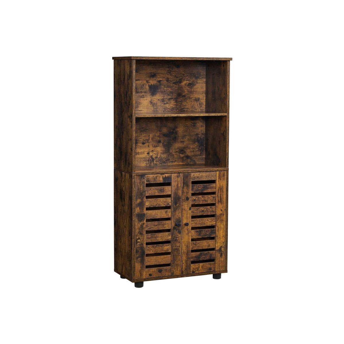 This floor standing cabinet offers large storage space with 2 open compartments and a double-door cabinet, featuring an adjustable shelf for items of varying heights. Crafted with premium particleboard, this bookcase boasts remarkable stability, enhanced by included anti-tip kits. The rustic brown surface with elegant wood grain and chic louvered doors creates a stylish and decorative vintage-style cabinet that will attract attention in your home. This versatile storage cabinet fits perfectly in your living room, study room, dining room, or kitchen, providing both functionality and aesthetic appeal.