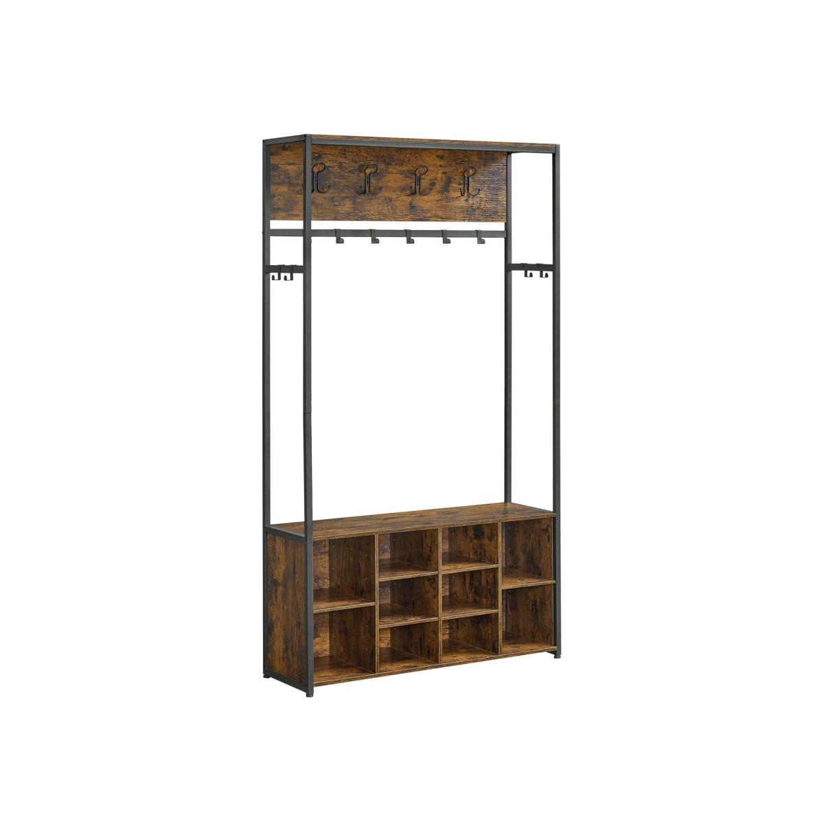 This multifunctional hall tree combines coat hooks, a top storage shelf, a shoe shelf, and a bench to optimise your space and create an organised and functional hallway. The customisable shelving unit features removable or adjustable lower shoe shelves with 5 height options, perfect for different shoes, decorations, or storage baskets. Equipped with 4 robust tri-hooks and 10 removable hooks with adjustable spacing, it caters for various items such as bags and hats. Crafted from premium particleboard and robust steel, this durable piece has a maximum load capacity of 136 kg, while its industrial charm and classic colour palette of rustic brown and ink black enhance your hallway's aesthetic.