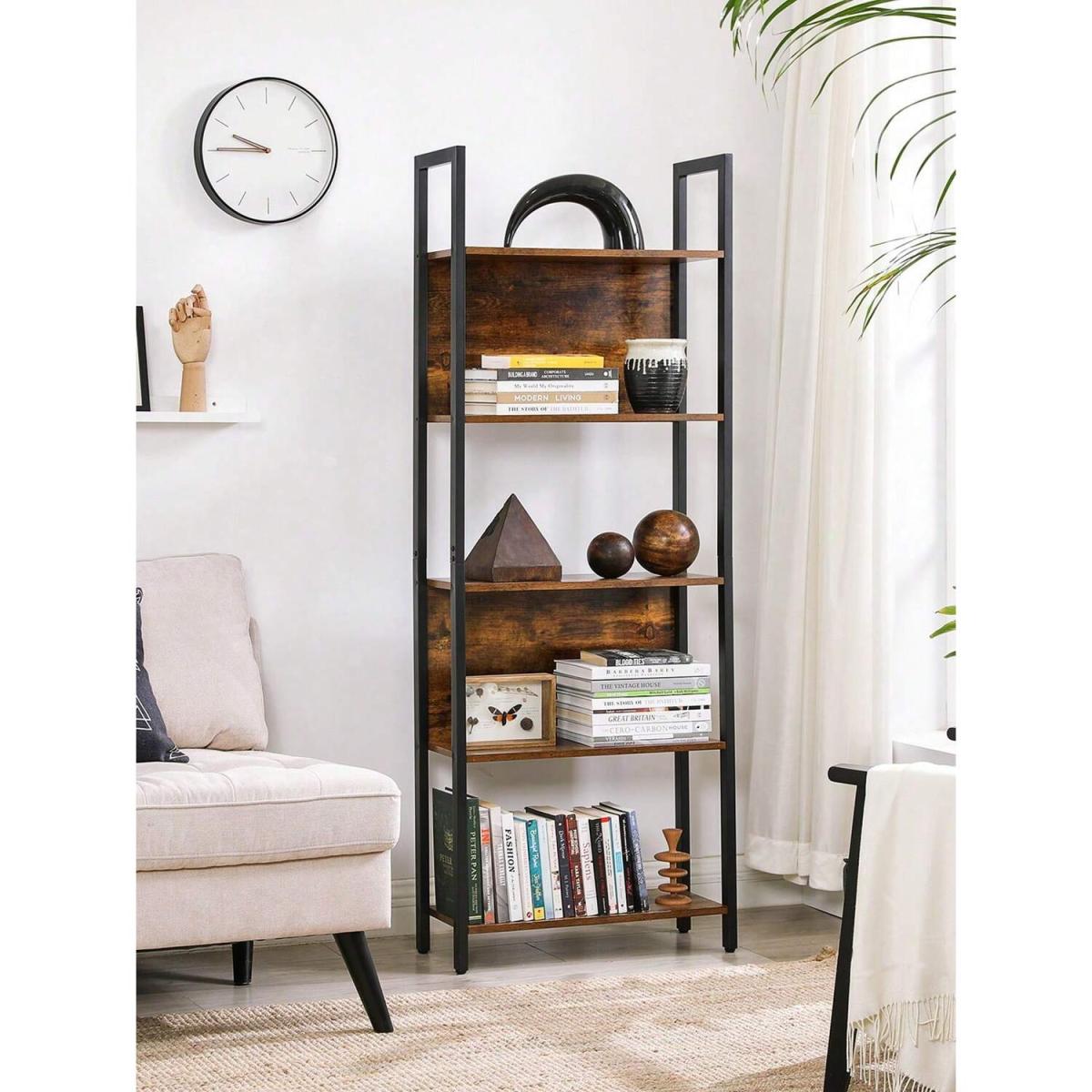 This stylish storage shelf features 5 large tiers, each supporting up to 20 kg, perfect for displaying your books and decoration collections. With 2 shelves equipped with a back panel, your precious objects are safe from falling, while adjustable feet ensure stability. The rustic brown shelves combined with a matte black steel frame create an industrial style that enhances any room, whether its for the office, entrance, or living room. Assembly is a breeze with easy-to-follow instructions and labelled parts.