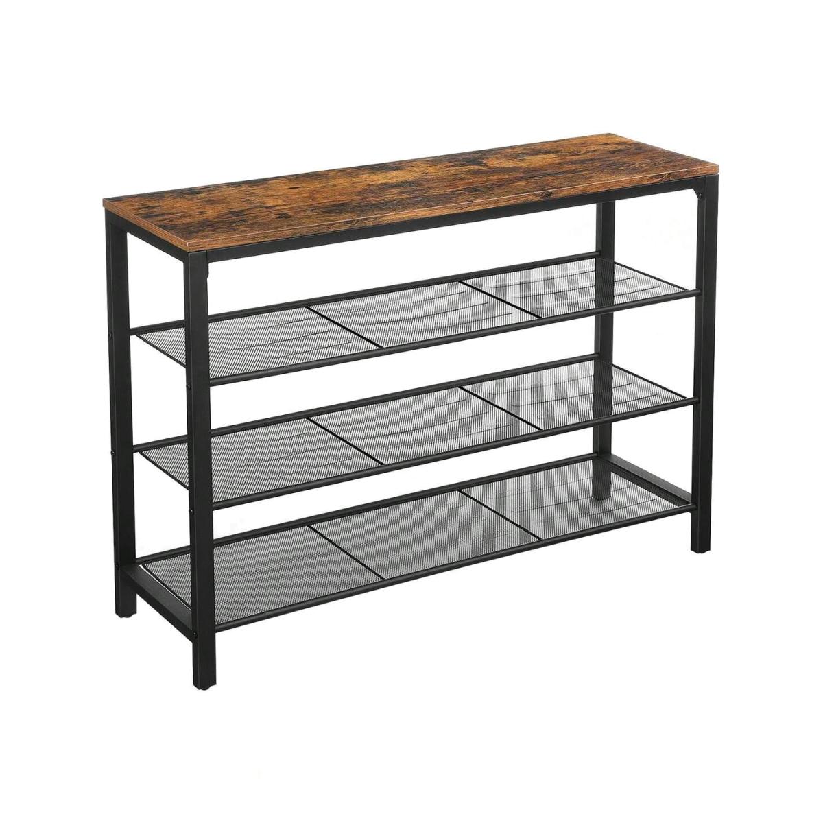 This shoe rack features a simple structure with a matte black steel frame and a rustic brown surface, harmonising beautifully. It can tidy up to 5 pairs of shoes or other objects on its stable mesh shelves, each holding up to 5 kg, ensuring order in your hallway. Assembly is a breeze with numbered parts and easy-to-follow instructions, requiring only a little time. The adjustable feet and anti-tip device provide solid and safe support, making it a reliable addition to your entryway, living room, or bedroom.