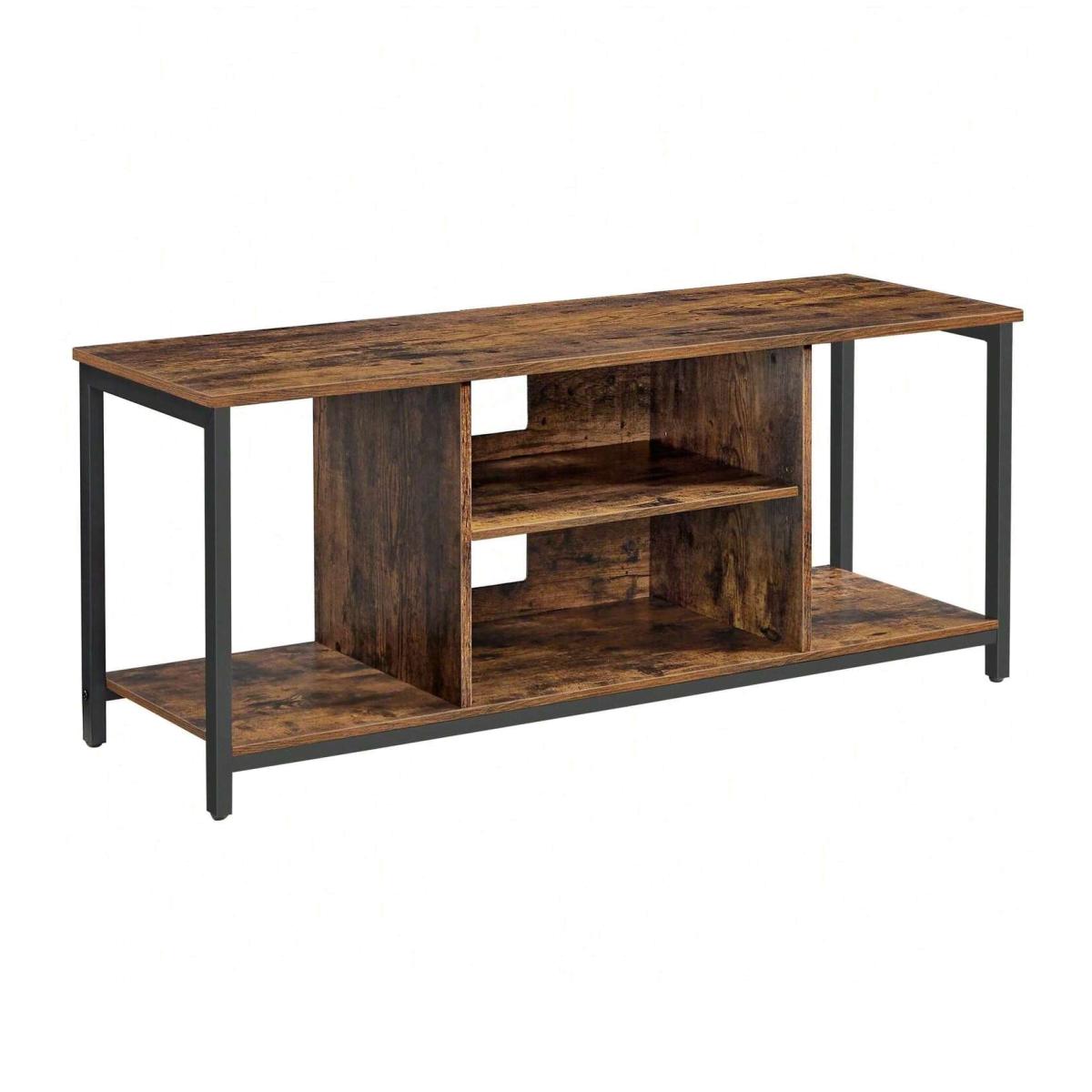 This industrial-style TV stand is designed for TVs up to 55 inches, offering both functionality and aesthetic appeal. With a spacious 120 x 40 cm top and multiple open shelves, it provides ample space for your movies, video games, and TV box, making it perfect for your living room or entertainment room. The sturdy particleboard panels and steel frame ensure stability, supporting up to 40 kg, while adjustable feet enhance its balance. Assembly is straightforward with clear instructions, allowing you to set it up quickly and enjoy your favourite series in style. Add a touch of rustic charm to your space with this versatile TV cabinet.
