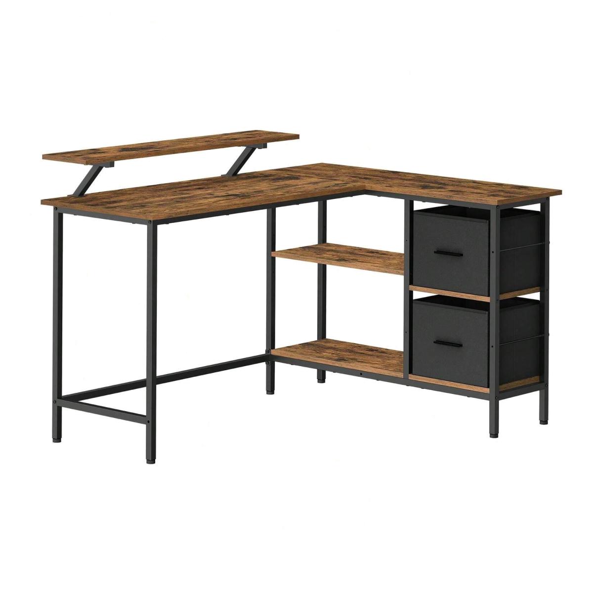 This L-shaped desk, measuring 105 x 135 x 89.5 cm, features a reversible design that allows for installation of the drawers on either the left or right side, making it a perfect fit for any corner of your home office, bedroom, or living room. With 2 spacious storage drawers and an adjustable middle shelf that caters to your storage requirements, this corner desk offers ample storage space. Constructed with a sturdy steel frame and reinforced crossbars, it supports up to 50 kg on the tabletop and 20 kg on the monitor stand. Adjustable feet ensure stability on various surfaces, while easy assembly is facilitated by a simple structure and clear instructions.