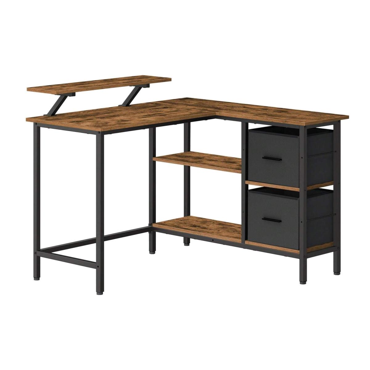 This L-shaped desk, measuring 105 x 115 x 89.5 cm, features a reversible design that allows for installation of the drawers on either the left or right side, making it a perfect fit for any corner of your home office, bedroom, or living room. With 2 spacious storage drawers and an adjustable middle shelf with 3 height levels, it offers ample storage space for files and office essentials. Constructed with a sturdy steel frame and reinforced crossbars, it supports up to 50 kg on the tabletop and 20 kg on the monitor stand. Adjustable feet ensure stability on various surfaces, while easy assembly is facilitated by a simple structure, numbered parts, and clear instructions.