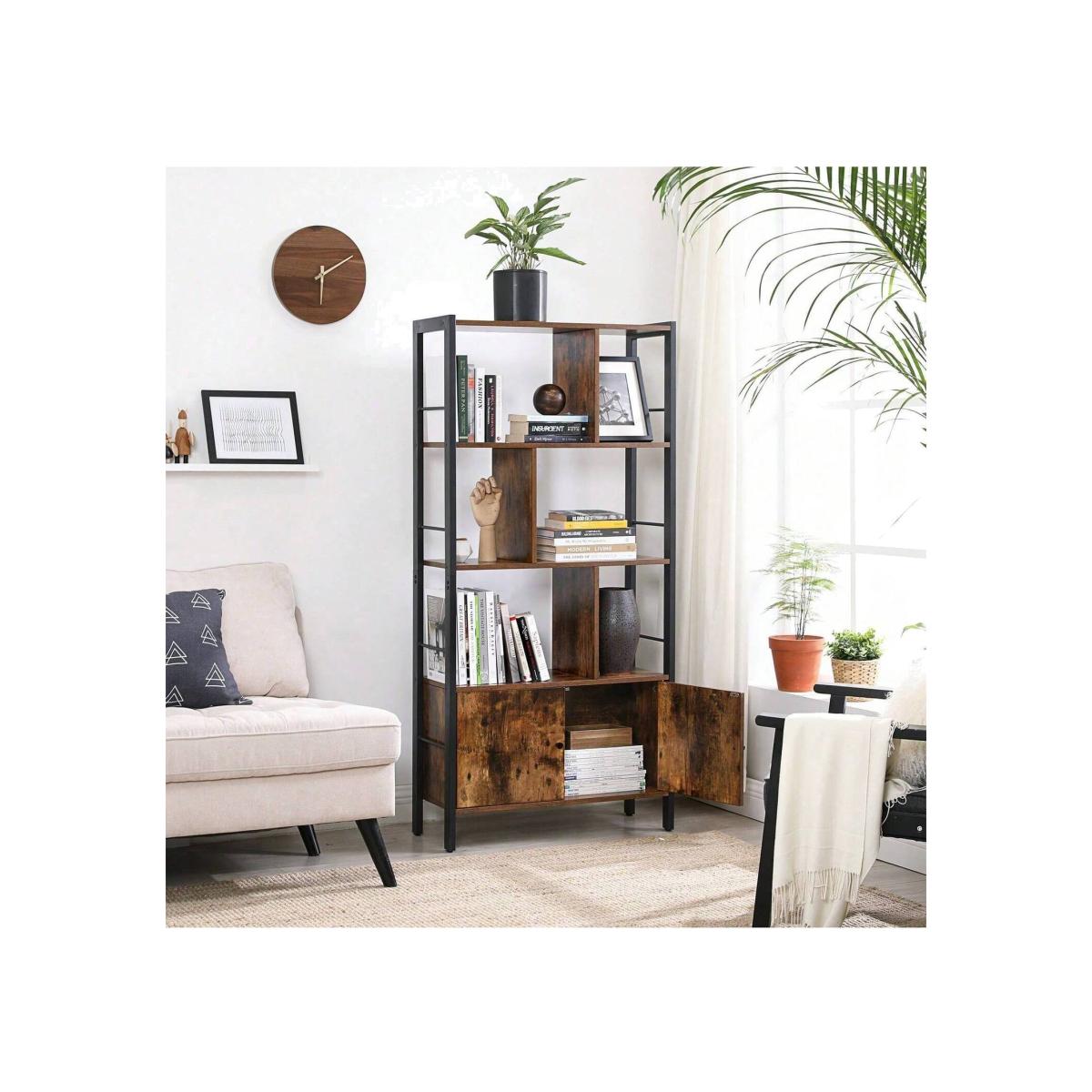 This large bookcase features a stable steel structure and an industrial style, perfect for your living room or office. With 4 shelves, including 3 open shelves with dividers and a closed compartment with 2 doors, it offers more than one way to store your items. The crossbars on the sides prevent books from falling off, while adjustable feet ensure it stands upright without wobbling. Designed to expand your collection, each shelf can hold up to 20 kg, making it both robust and functional. Assembly is straightforward with clear instructions, an anti-tip kit for safety, and a useful assembly tool included.