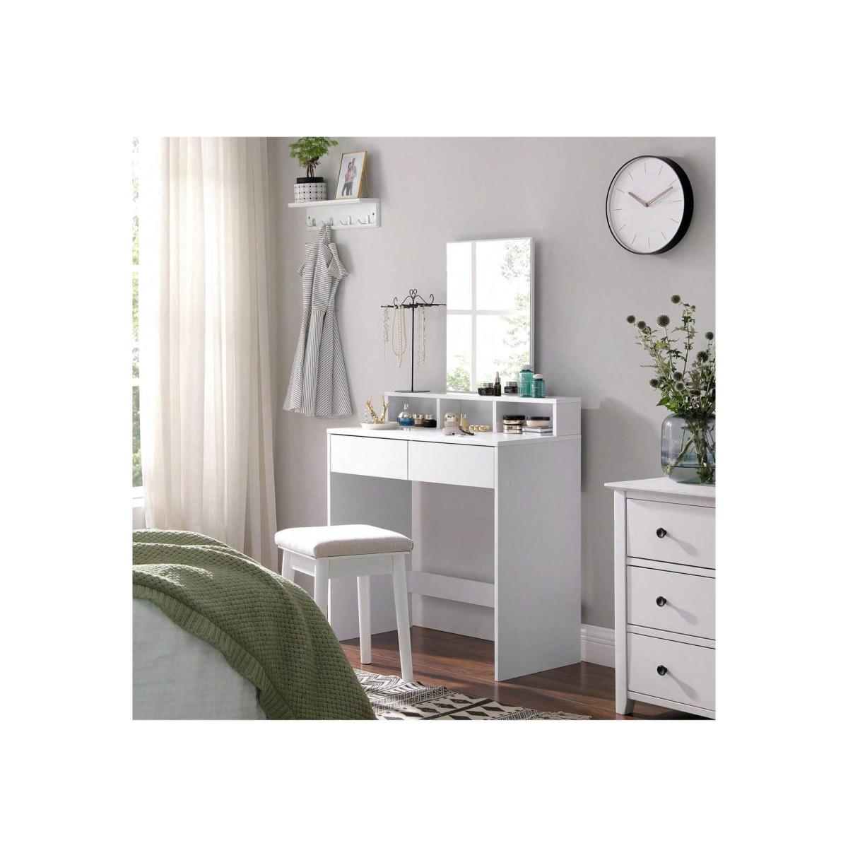 This dressing table features a roomy yet space-saving design, measuring only 40 x 80 cm, making it ideal for small spaces. It includes 2 drawers, 1 large shelf, and 3 open compartments, providing ample space to keep your cosmetics tidy and within reach. The large, clear mirror, measuring 40 x 53 cm, allows for flawless makeup application. For added safety, an anti-tip kit is included to secure the vanity table to the wall. With its simple, modern style, clean lines, and sleek white colour, this makeup desk enhances your bedroom decor.