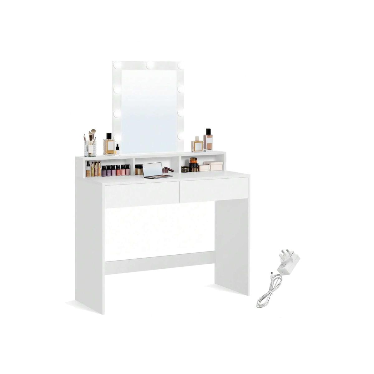 This dressing table features LED lights with adjustable brightness, equipped with 9 bulbs that allow you to customise the light for perfect make-up application. Its roomy yet space-saving design includes 1 raised shelf for perfumes, 3 open compartments for lipsticks, and 2 drawers for hairdryers and hair straighteners, keeping your cosmetics tidy and within reach. The hidden light cables provide a cleaner, more aesthetically pleasing look, while the anti-tip kit ensures added safety by securing the vanity table to the wall. Made of quality particleboard, this sturdy and easy-to-clean dressing table boasts a wear-resistant veneer surface for long-lasting use.