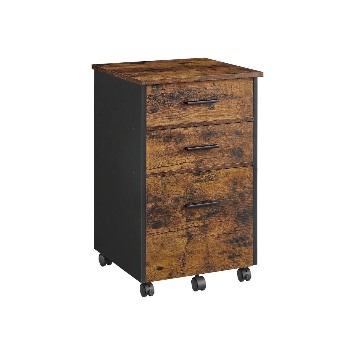 This rolling office filing cabinet features 3 drawers, including 2 fabric drawers for simplified assembly, allowing you to set it up easily with clear instructions and numbered parts. Despite its space-saving size of 42 x 43 x 67.5 cm, it offers large storage space, with the bottom drawer accommodating A4 and letter-sized hanging files. The charming industrial style, combining rustic brown and black hues, enhances any workspace. Built with a stable particleboard structure, each fabric drawer holds up to 9 kg, while the top supports 50 kg. Equipped with 5 quality castors, including 2 with brakes, it allows for easy mobility and stability when fully loaded.