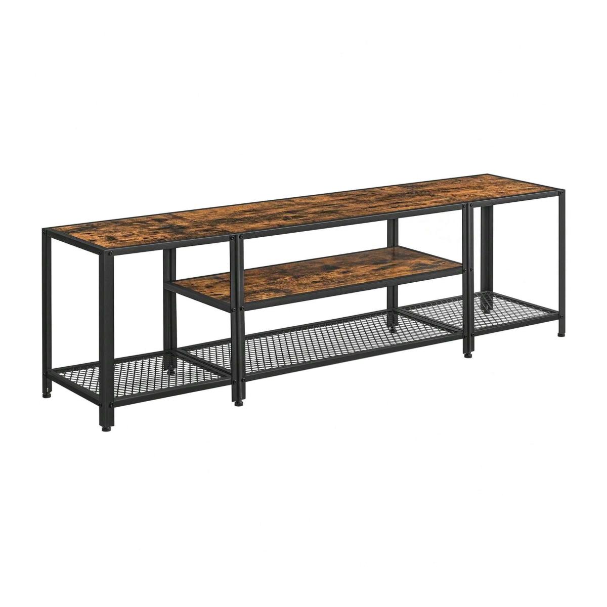 This multi-functional TV stand accommodates TVs up to 75 inches and features 4 open shelves, making it ideal for organising your electronics in the living room or bedroom. Constructed from robust particleboard with a steel frame, it supports up to 80 kg on the top and 10 kg on each lower shelf, ensuring long-term stability. The open design promotes ventilation to prevent overheating, while easy access to cables simplifies installation. With a rustic brown finish and black metal frame, it adds a charming touch to your decor. Assembly is straightforward with numbered parts and illustrated instructions, and the water-resistant panels allow for easy cleaning.