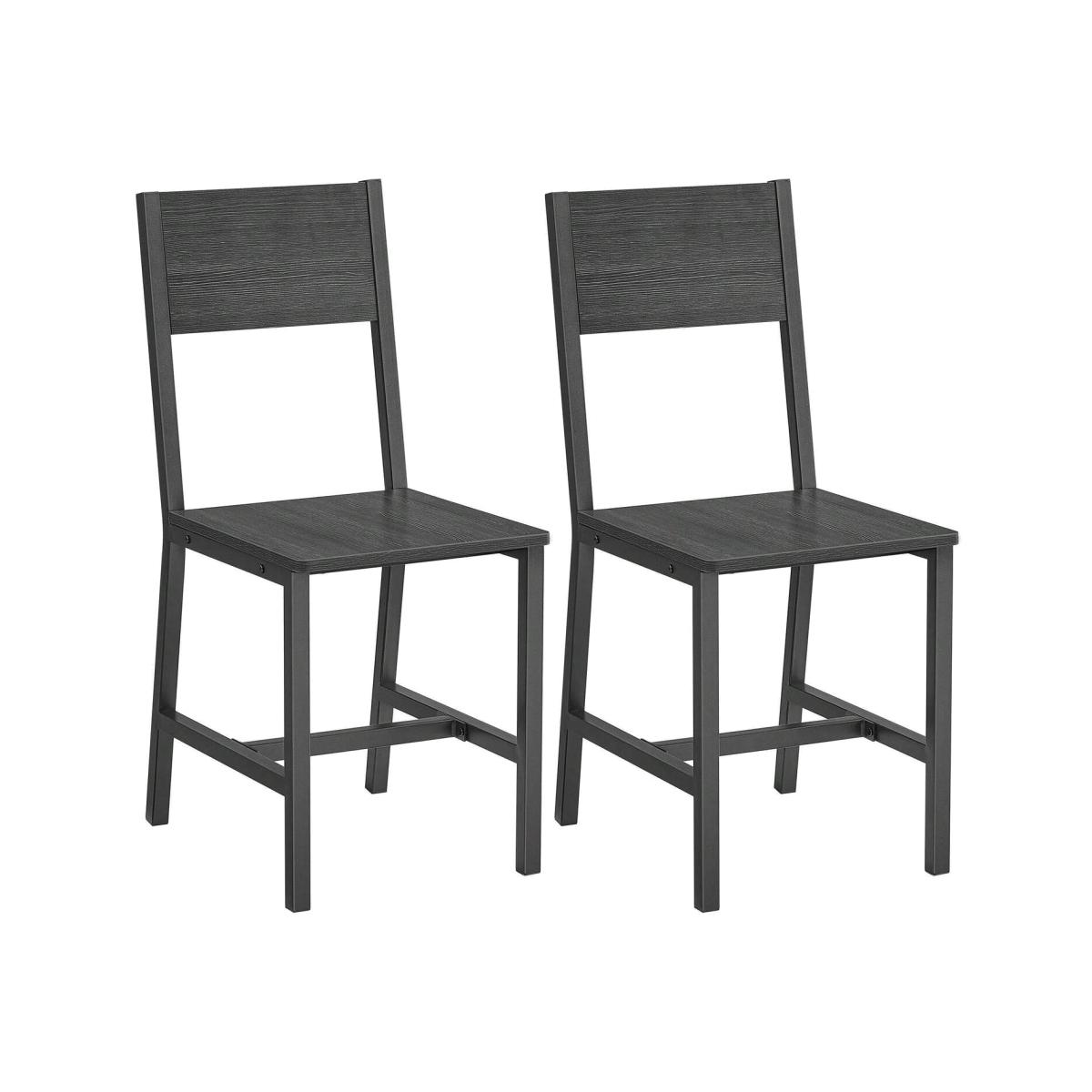 Indulge in a stylish dining experience! Ink black steel frames paired with charcoal grey boards create elegant chairs that set a delightful dining mood. Sit back with ease as the 102 angle between the backrest and seat offers ergonomic comfort and support. The 100 angle formed by the bottom crossbar, steel frame, and particleboard seat ensures maximum stability. Assembly is a breeze with numbered parts and clear instructions. You'll receive a set of 2 inviting and comfy chairs that slide neatly under the table after dinner.