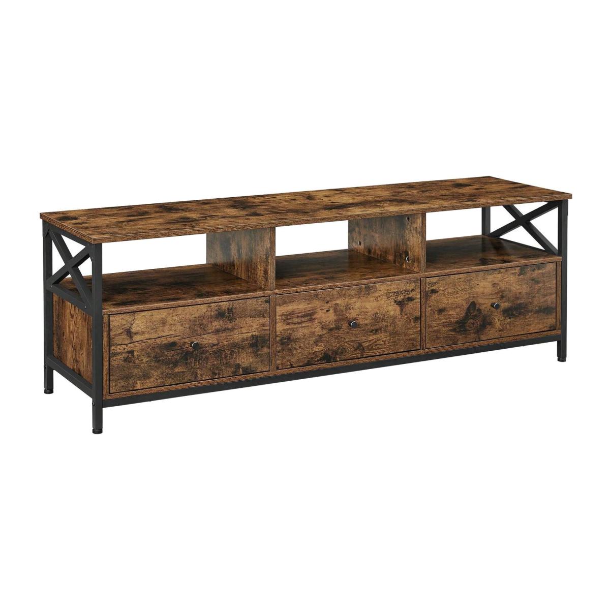 This TV stand accommodates TVs up to 80 inches and features 3 drawers for closed storage, alongside 3 open shelves to display small decor pieces, making it perfect for your living room. With a black steel frame, rustic brown panels, and X-shaped bars, it boasts a unique industrial charm that serves as the focal point of your space. Expertly crafted with steel and high-quality particleboard, it supports up to 105 kg, ensuring stability and durability for years of reliable entertainment. Assembly is effortless with easy-to-follow instructions and numbered parts, allowing you to relax and enjoy your favourite shows in no time.