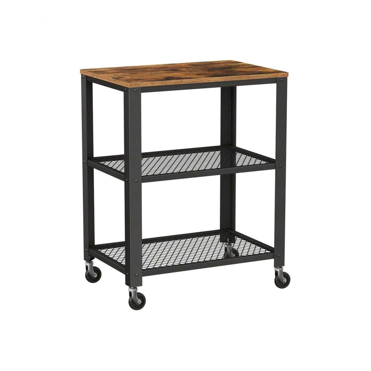 This vintage 3-tier serving trolley features a rustic design with a heavy-duty storage shelf, crafted from particleboard with a wood grain finish, ensuring durability and resistance to water and wear. Its thick metal frame provides stability, making it ideal for holding books, magazines, and laptops. The industrial style and simple construction create an attractive, modern look that complements various interior decors. With spacious storage capacity, this utility cart saves floor space and is perfect for small kitchens. Equipped with wheels for easy mobility, it can be secured in place with adjustable feet, making it a versatile solution for organising kitchen wares and more.