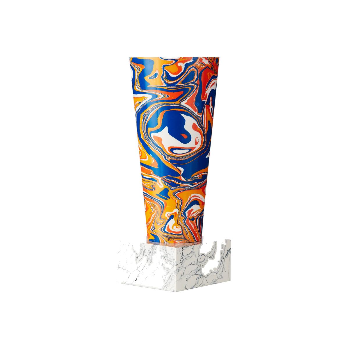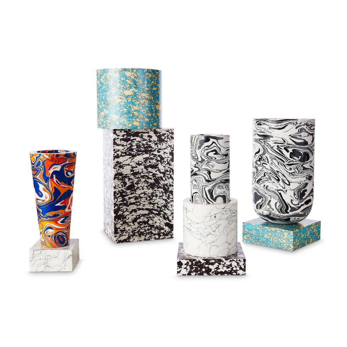 A psychedelic interpretation of the Italian post-modernist aesthetic, the Swirl collection has a certain pop feel about it. Adorned with bold patterns, the geometric shapes are stacked to create multi-dimensional and functional sculptures. Tom Dixon pursues his artistic research inspired by post-consumer processes, the waste phenomenon and its management, and the recycling practices of used materials. The Swirl collection is made up of a material that imitates marble, made from industrial waste : recycled marble powder from sawmills. This powder is mixed with coloured pigments and resin. The material is then cut and turned by hand. The marble pattern provides superb mineral decoration. Because of the pigmentation process, each piece has a unique pattern. The Swirl vases are inspired by Ikebana, the Japanese art of flower arranging. Anchored to a heavy base, the cylindrical vases wonderfully showcase flowers and foliage.