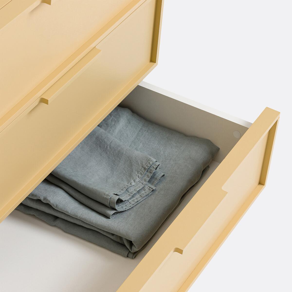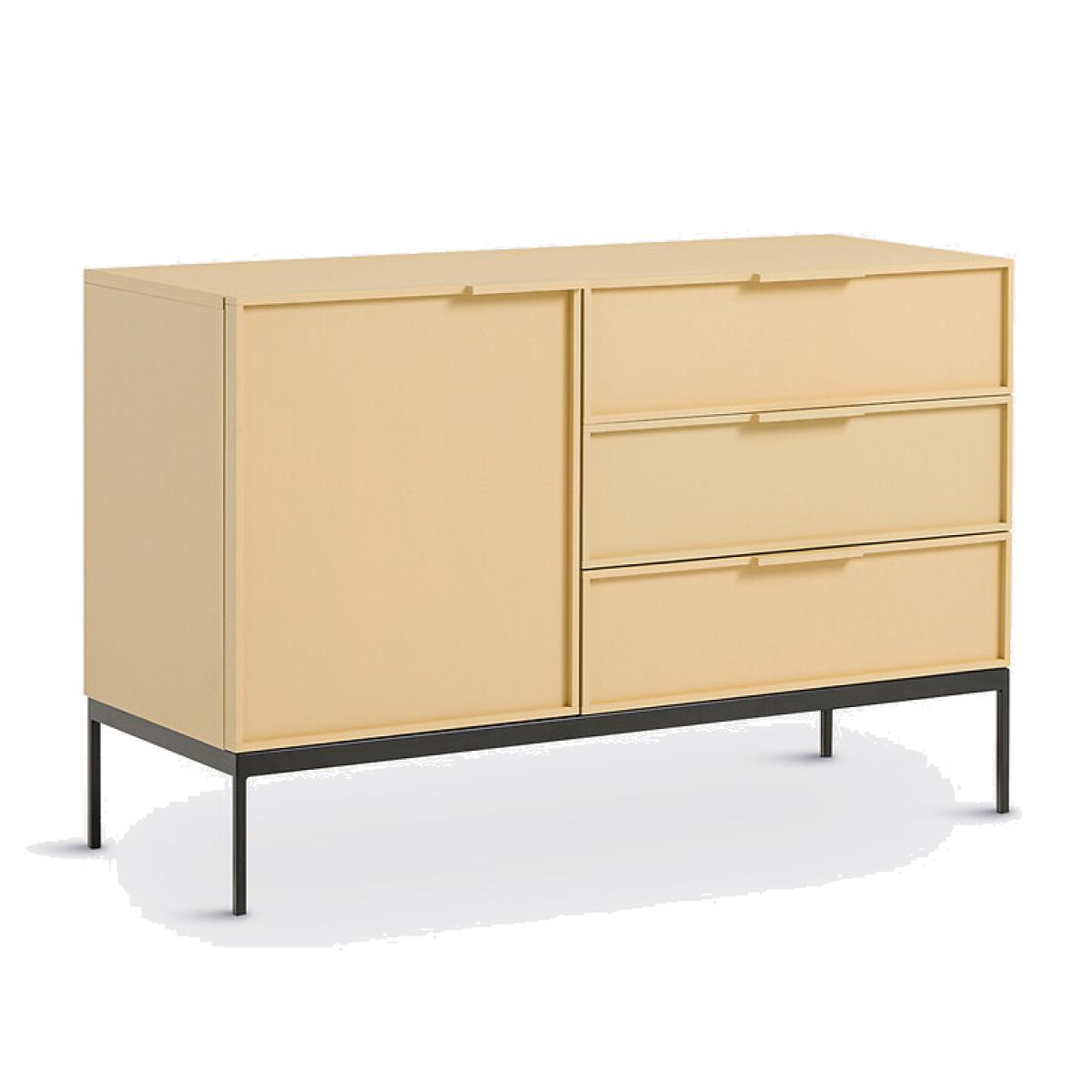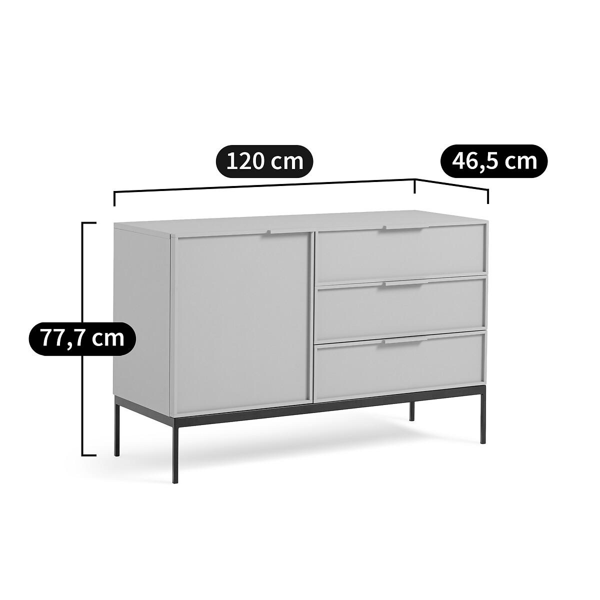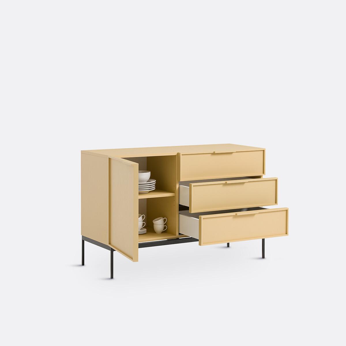 The Vati sideboard offers a bold colour. An elegant piece of storage furniture, its simple design combines aesthetics and practicality. It is made up of a large unit with an adjustable shelf, and 3 large drawers. Made in Europe, it is a creation of the designers at La Redoute Interiors. Product Details • Unit and door in yellow FSC® particle board, water-based paint with matte finish and high-density panel bottom • MDF door frame painted with water-based paint • 1 removable shelf, adjustable in height • Soft closing door • Black steel baseDimensions. Overall • Width: 120 cm • Height: 77.7cm • Depth: 46.5cmDelivery:. Assembly required. Available for home delivery. Note! Please check that all access points are large enough to accommodate your delivery (doors, stairs, lifts). • Made in Europe. • WOOD FROM SUSTAINABLY MANAGED FORESTS. FSC® certified wood comes from forests that are environmentally, socially and economically well managed. Dimensions and weight of parcel3 parcels • L123 x H24 x D47cm. 10.4kg • L143 x H9 x D50cm. 24.1kg • L93 x H15 x D67cm. 20.8kg