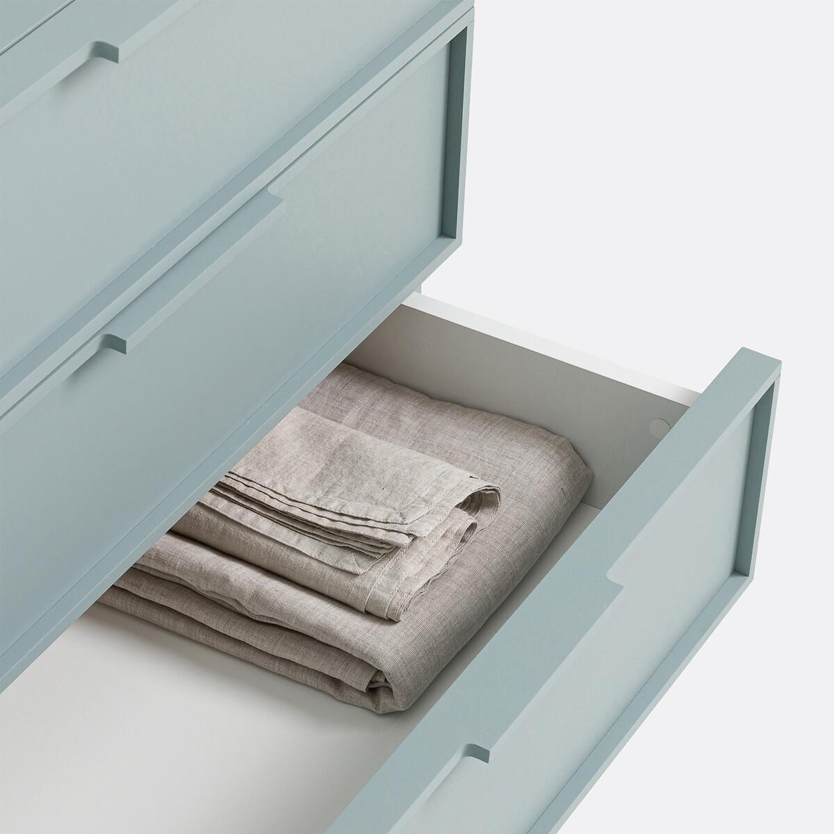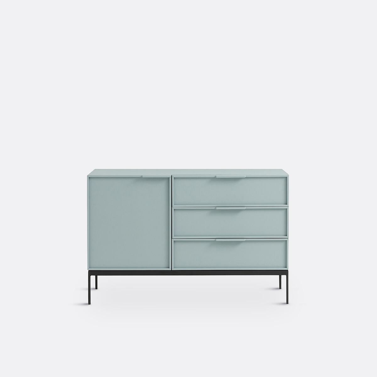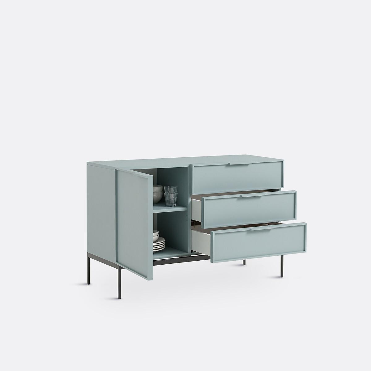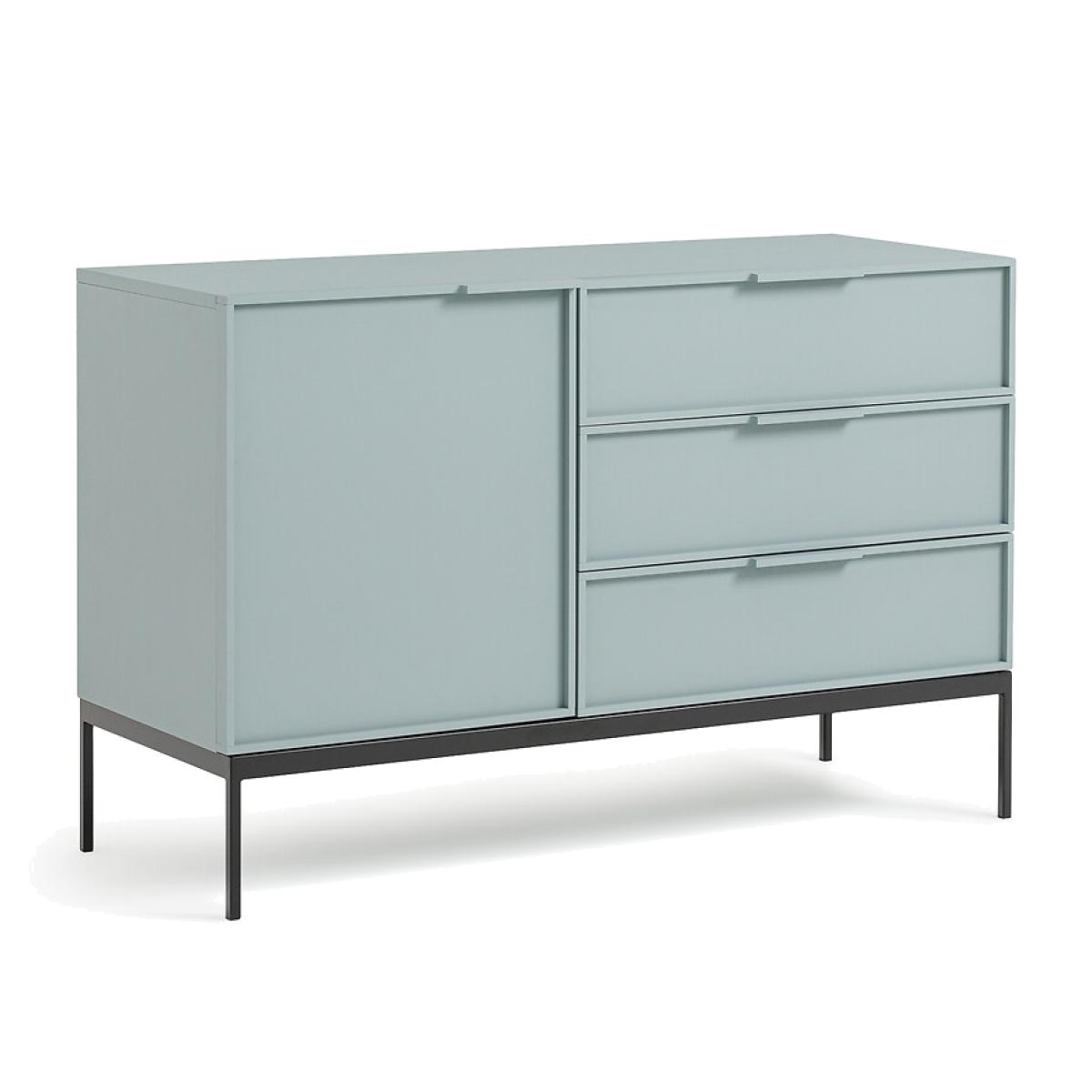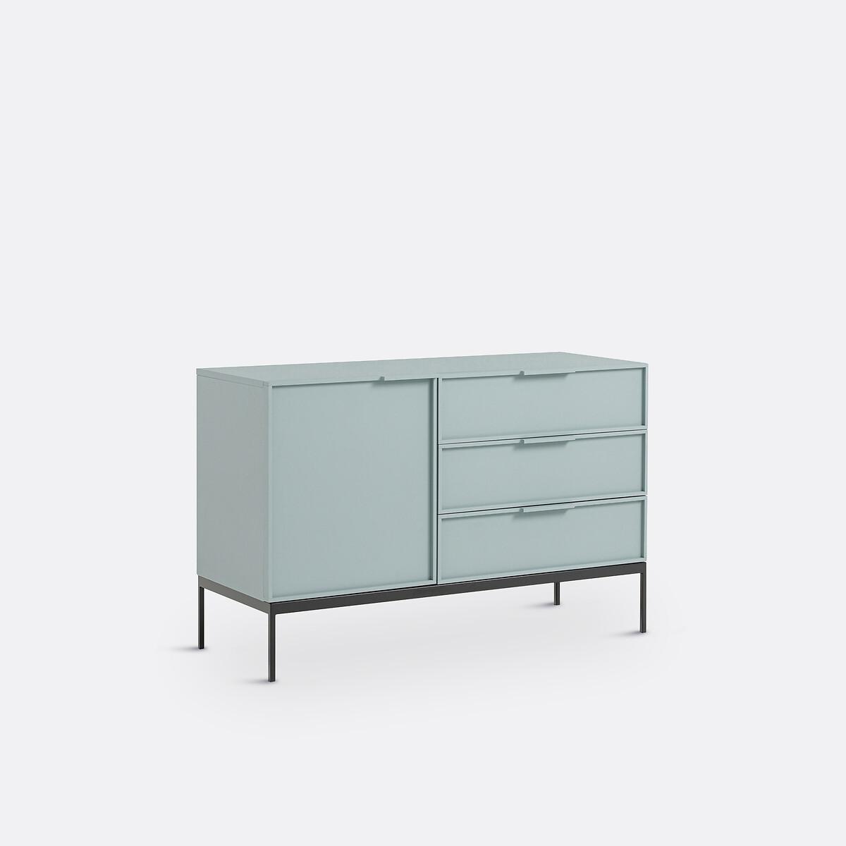 This Vati sideboard offers a fresh colour. An elegant piece of storage furniture, its simple design combines aesthetics and practicality. It is made up of a large unit with an adjustable shelf, and 3 large drawers. Made in Europe, it is a creation of the designers at La Redoute Interiors. Product Details • Unit and door in blue FSC® chipboard, water-based paint with matte finish and high-density panel base • MDF door frame painted with water-based paint • 1 removable, height-adjustable shelf • Soft closing door • Black steel baseDimensions. Overall • Width: 120cm • Height: 77.7cm • Depth: 46.5cm. Delivery: • Assembly required. Available for home delivery. Note! Please check that all access points are large enough to accommodate your delivery (doors, stairs, lifts). • Made in Europe. • WOOD FROM SUSTAINABLY MANAGED FORESTS. FSC® certified wood comes from forests that are environmentally, socially and economically well managed. Dimensions and weight of parcel3 parcels • L123 x H24 x D47cm. 10.4kg • L143 x H9 x D50cm. 24.1kg • L93 x H15 x D67cm. 20.8kg