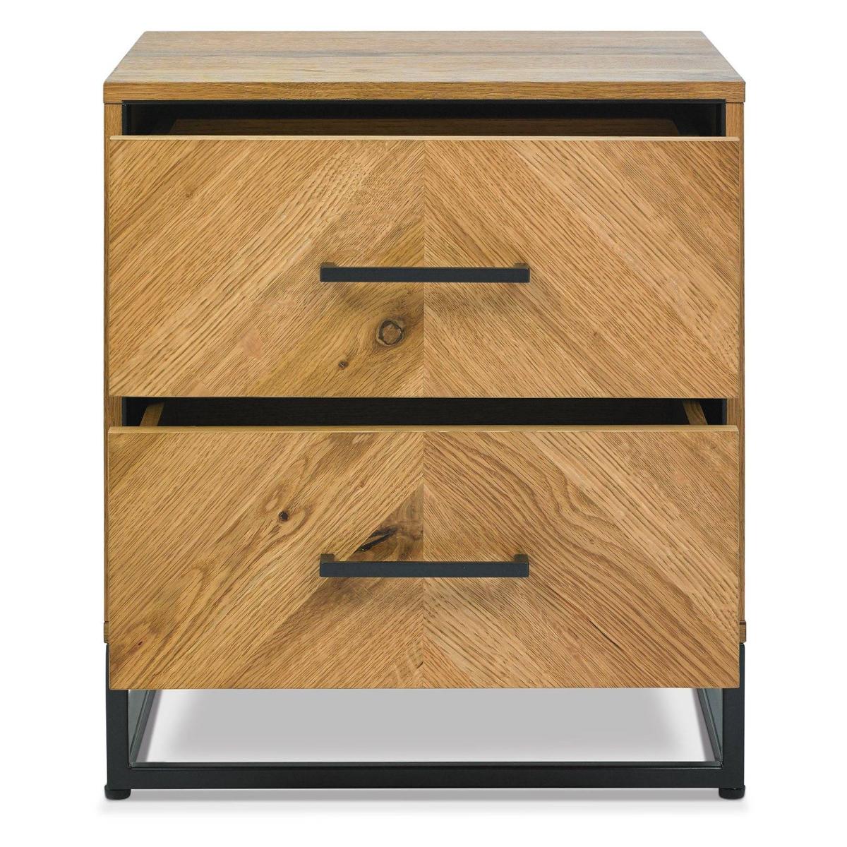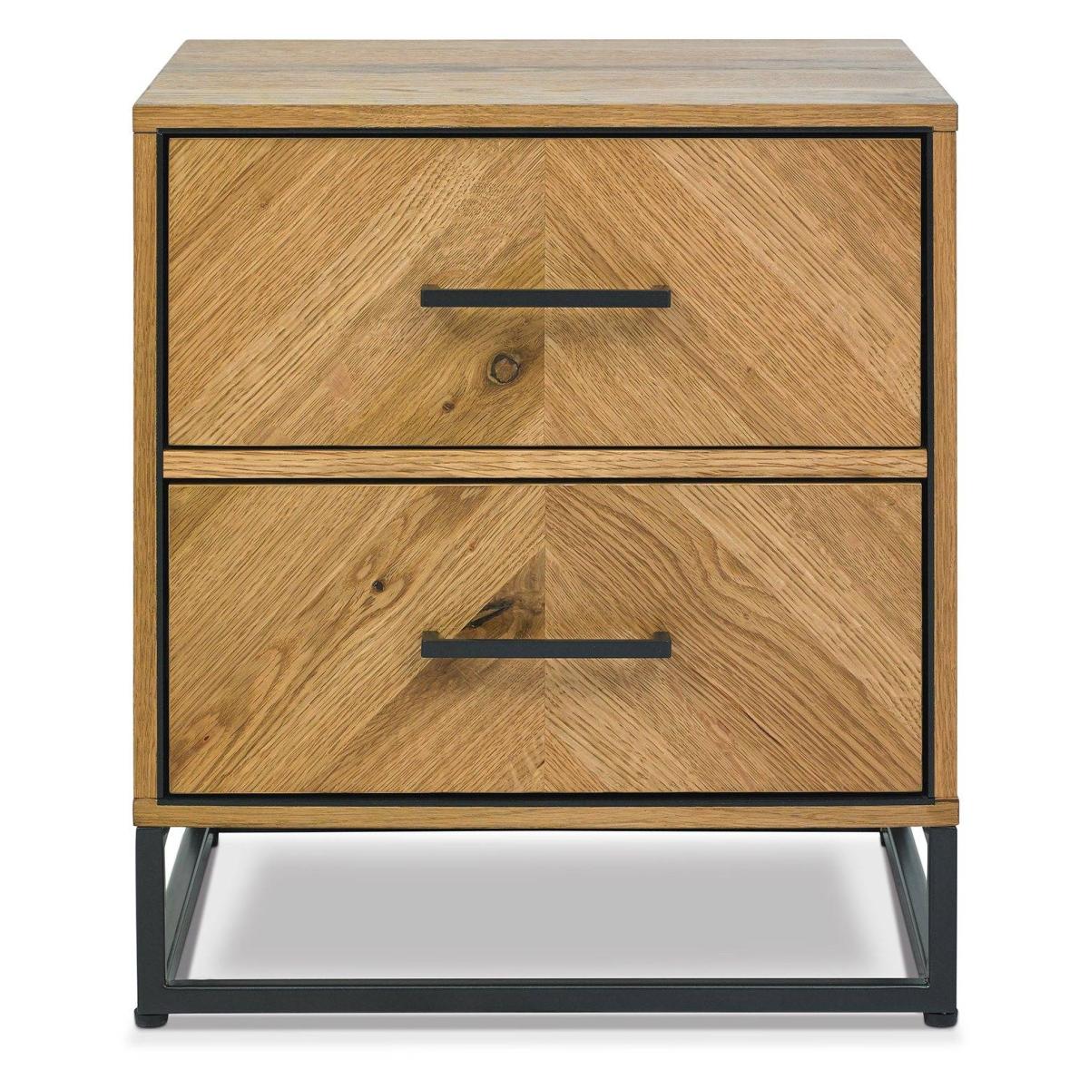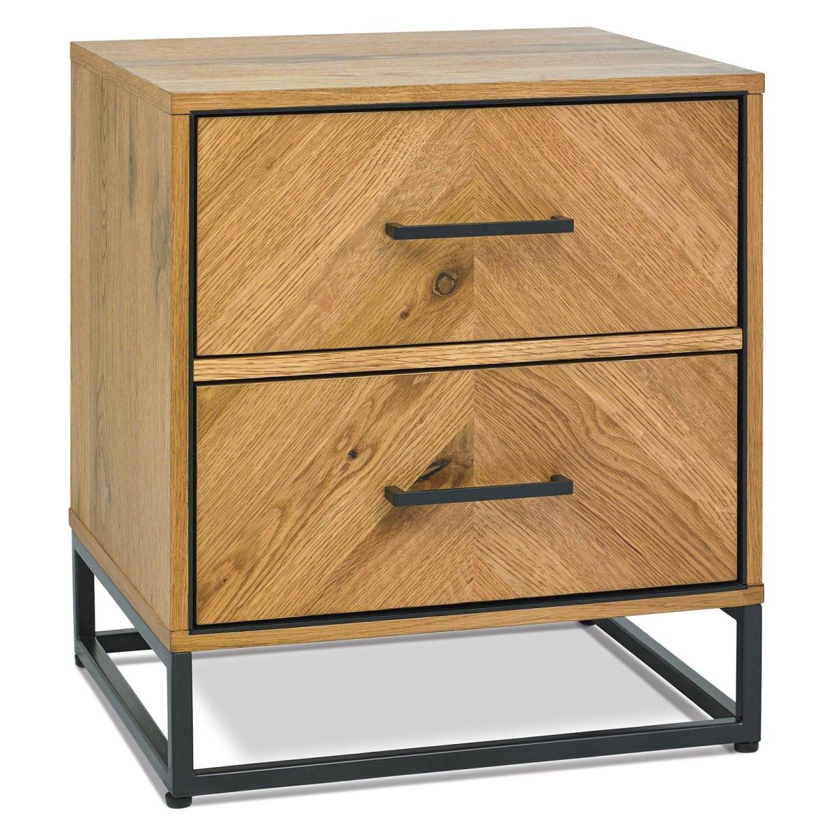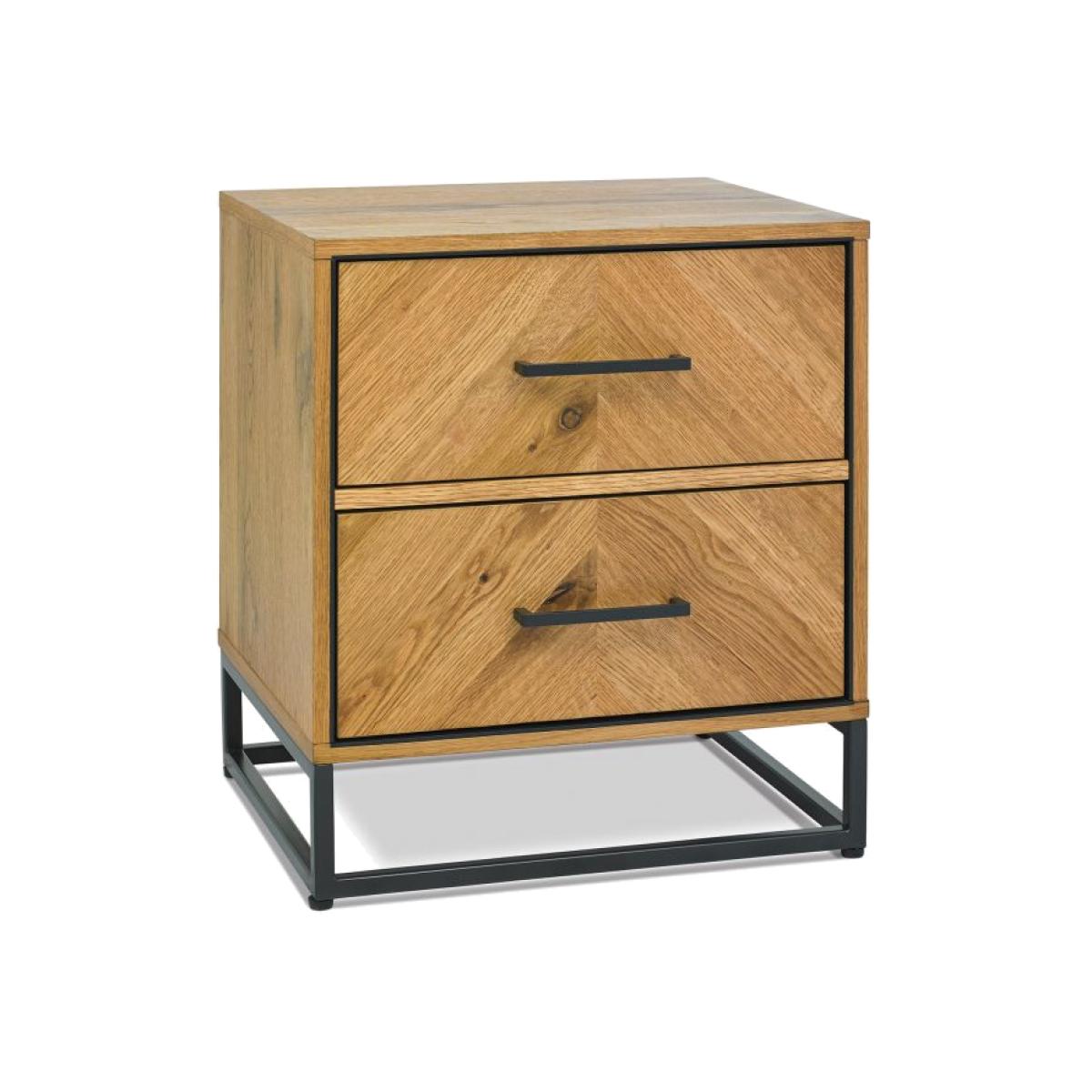 With dynamic zigzagging veneer pattern, Vaughan Chevron Oak is sure to make a stylish statement in any contemporary bedroom. Consisting of rustic oak veneers that are hand laid in a chevron pattern and oiled to highlight the rich character of oak, this range adds warmth and texture in abundance. Contrasting peppercorn inlay detail within the recesses of the drawers, doors and headboards combine with the peppercorn powder coated metal frames to give the range a slightly industrial edge. Quality mechanisms such as fully extending side mounted soft-close drawer runners add functional finishing touches to Vaughan's on-trend, mixed-media aesthetic, resulting in a collection that is both practical and stylish. 2 Year Guarantee. Dimensions:W 46cm x D 38cm x H 51cm Assembly Required All screens vary in colour reproduction and whilst every effort has been made to display the colour as accurately as possible it is for guidance only.