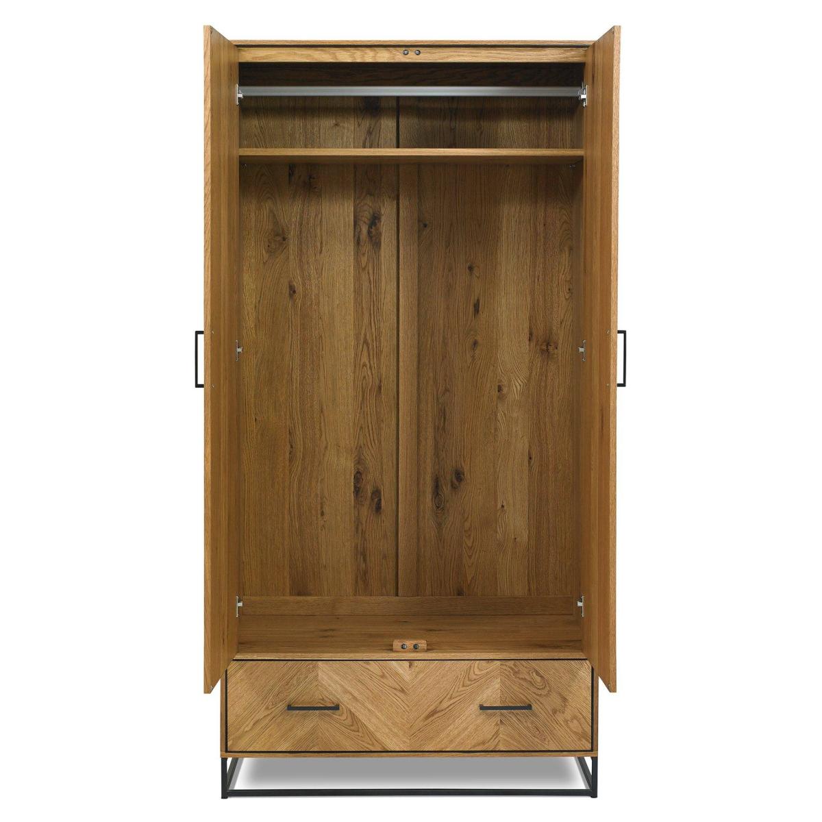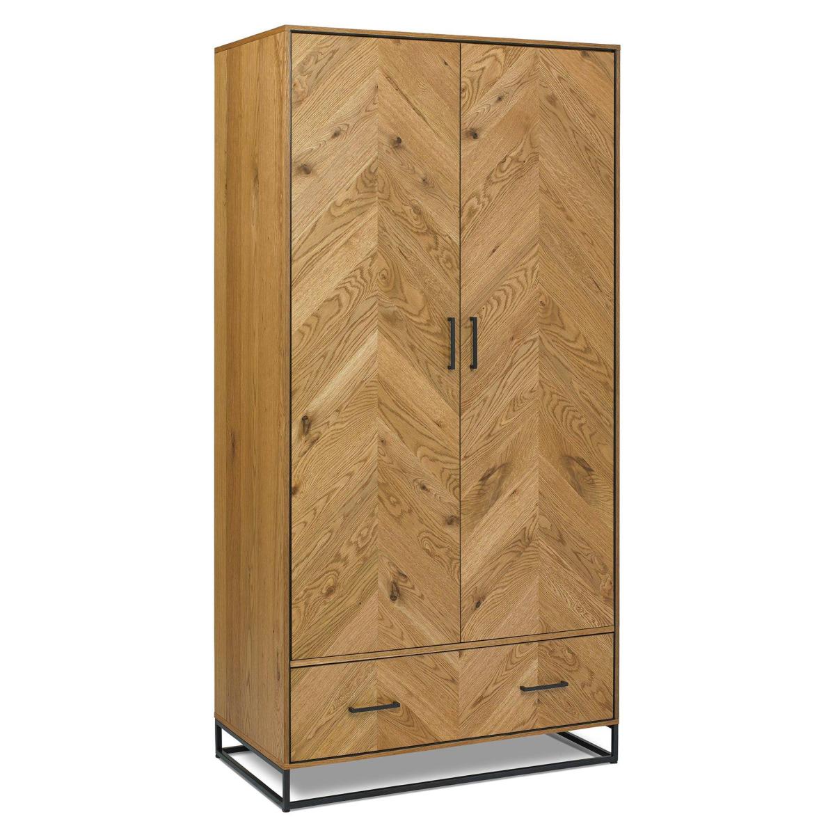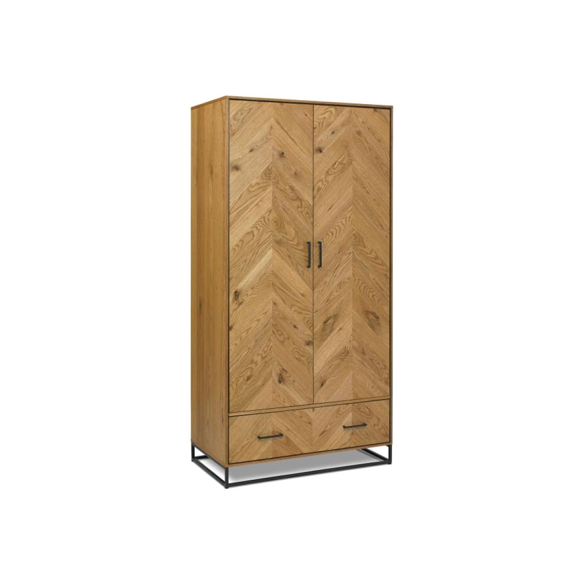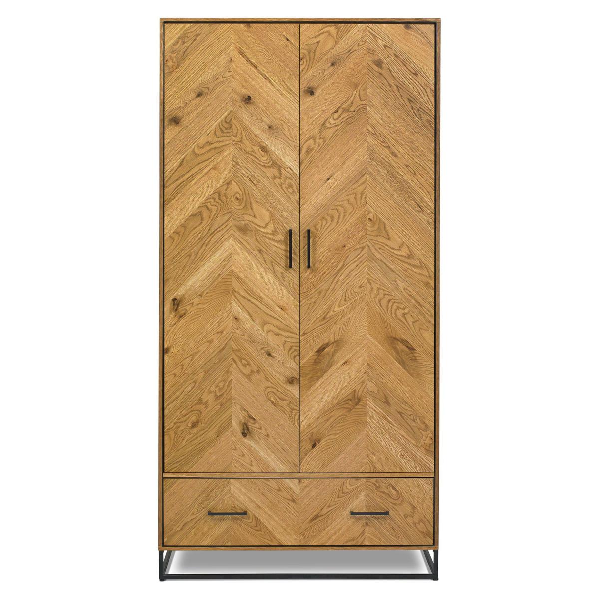 With dynamic zigzagging veneer pattern, Vaughan Chevron Oak is sure to make a stylish statement in any contemporary bedroom. Consisting of rustic oak veneers that are hand laid in a chevron pattern and oiled to highlight the rich character of oak, this range adds warmth and texture in abundance. Contrasting peppercorn inlay detail within the recesses of the drawers, doors and headboards combine with the peppercorn powder coated metal frames to give the range a slightly industrial edge. Quality mechanisms such as fully extending side mounted soft-close drawer runners add functional finishing touches to Vaughan's on-trend, mixed-media aesthetic, resulting in a collection that is both practical and stylish. 2 Year Guarantee Dimensions:W 100cm x D 56cm x H 200cm Assembly Required All screens vary in colour reproduction and whilst every effort has been made to display the colour as accurately as possible it is for guidance only.