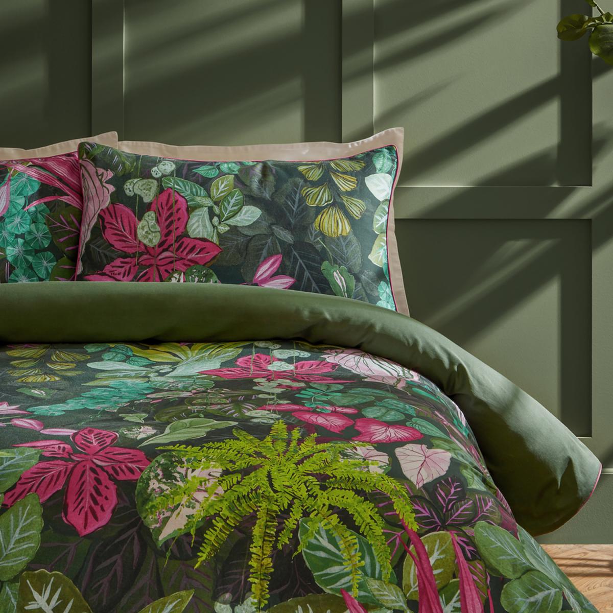 Transport yourself to the depths of this South American jungle Veadeiros truly brings the outdoors in. With its luscious, voluptuous, and hand-painted watercolour foliage in tones of green with neon pink elements, this beautiful bedding is sure to leave you dreaming of wanderlust. This pillowcase pair has a plain, tonal colour reverse and a complementing piped edge, adding a seamless finish.