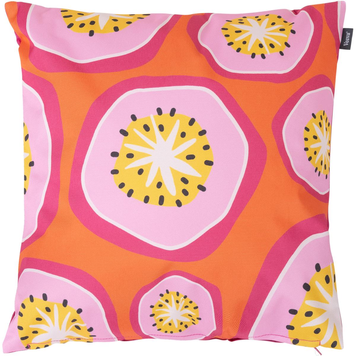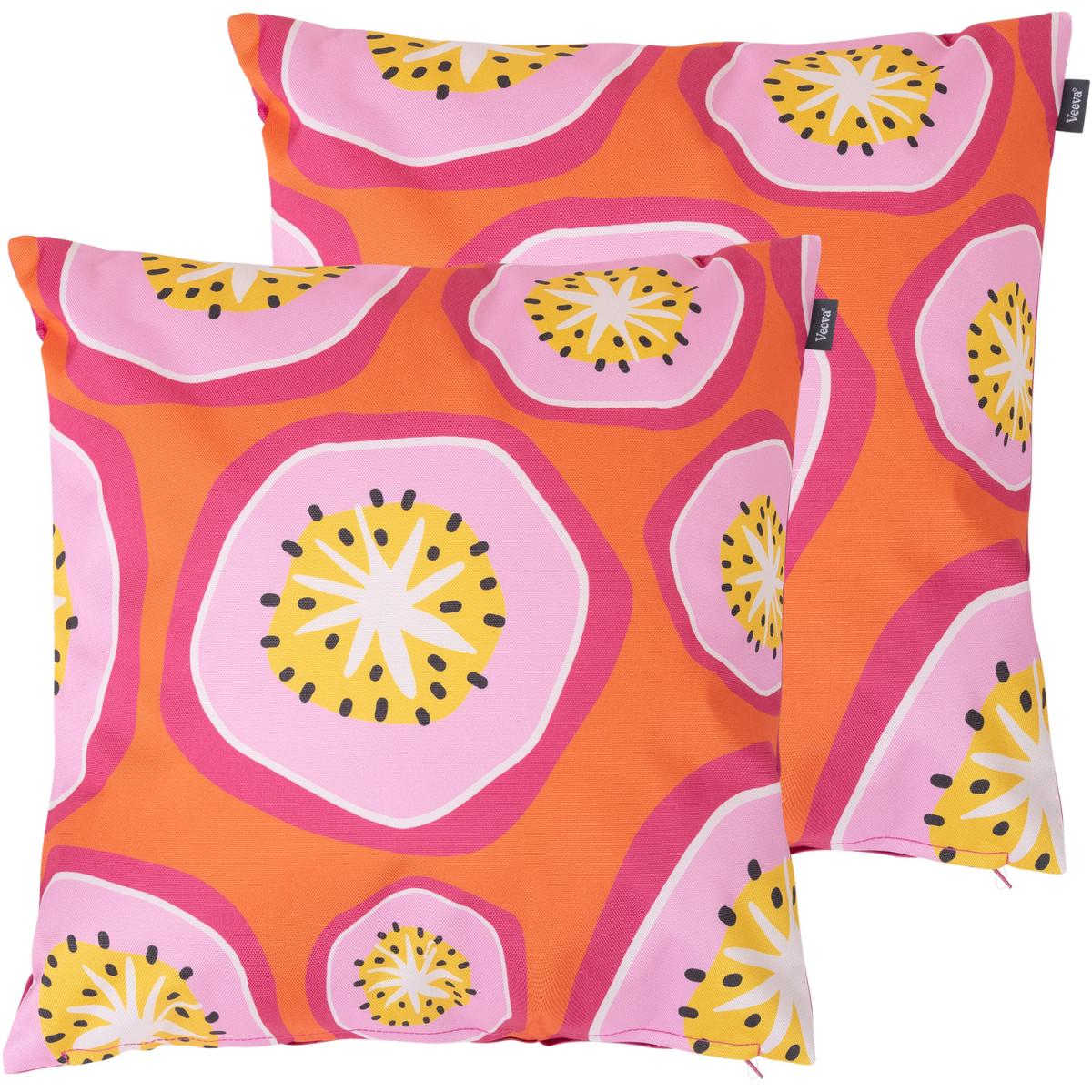 This mouth-watering passionfruit print cushion is super juicy! Bursting with bright orange, energising pink, and sunshine yellow, it will add the wow-factor to any space. The reversible design means you can switch your decor up as you please. Great for customising the look and feel of any space, this cushion is suitable for both in and outdoor use. It is designed to withstand showers and spills with its water-resistant fabric and hidden zip closure. Complete with a highly breathable inner, these cushions are incredibly soft, shape retaining and supportive. Mix and match colours and patterns to create a sunny sanctuary that works for your space.