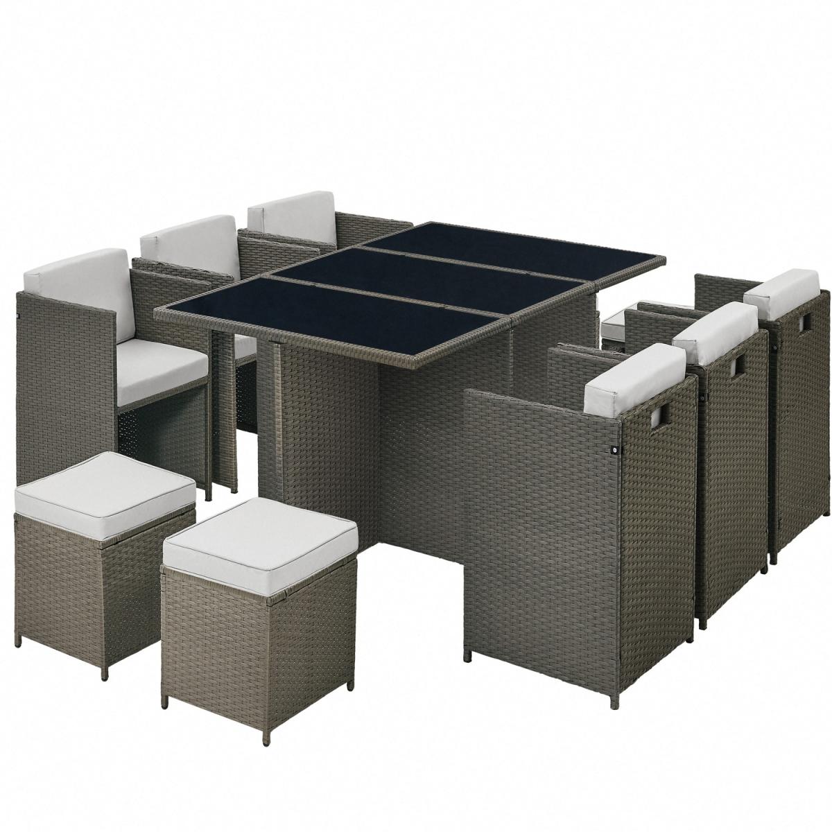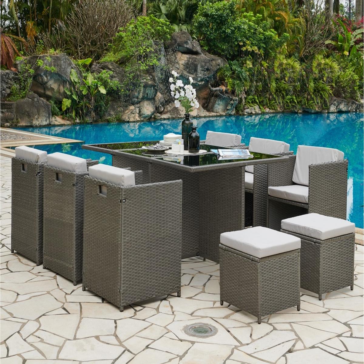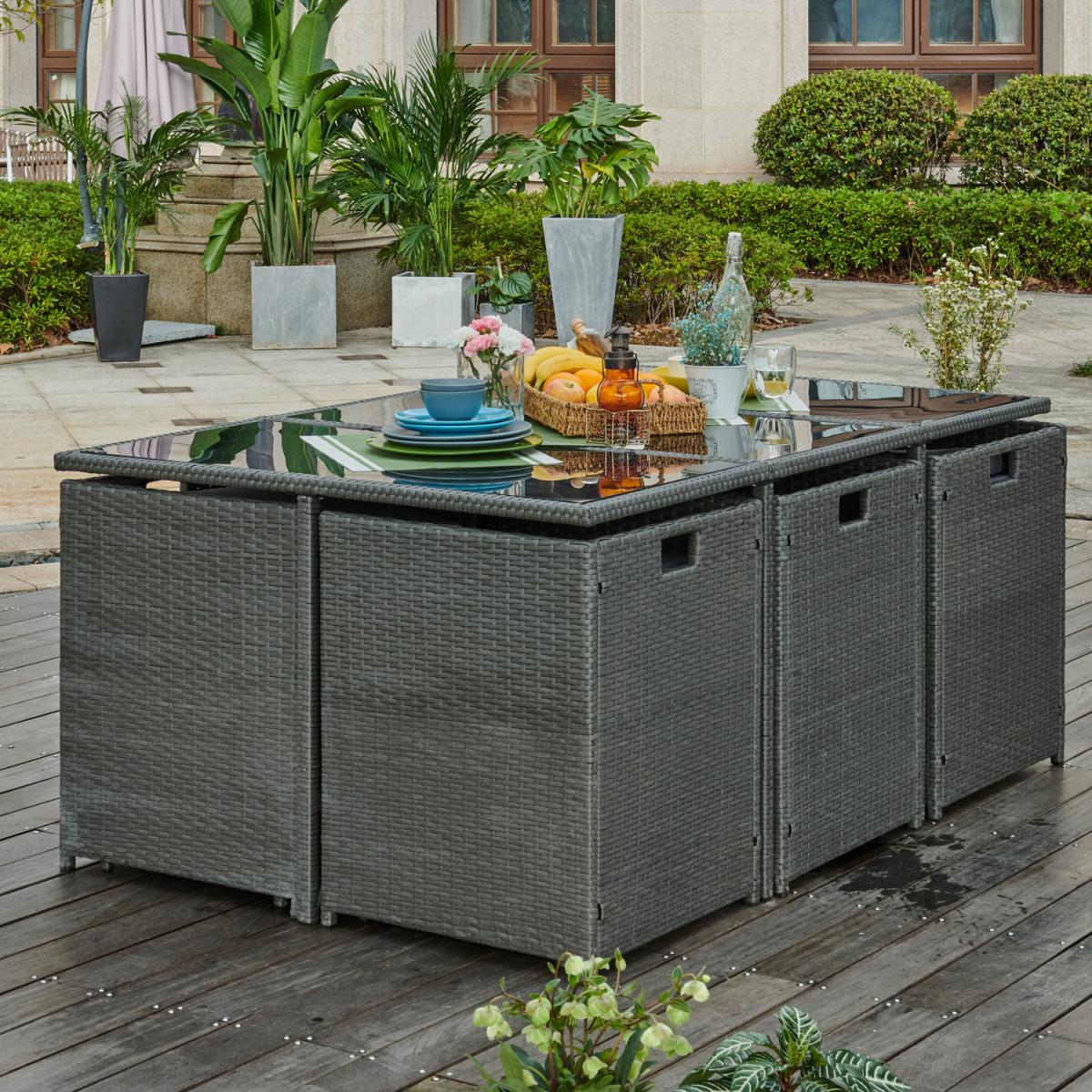 Introducing Vega an 11 piece garden furniture set. It comes with 1 dining table, 6 garden single chairs and 4 garden stools allowing a maximum of 10 people to sit. This garden set is made from PE rattan, modern and stylish for your any garden! This set does not come with a cover - we recommend you purchase a waterproof cover to preserve your garden set when not in use. The rattan is waterproof and can withstand wet weather but we highly recommend covering the set in any periods of wet or damp weather. The cushions are not fully waterproof, we recommend these are kept indoors or a completely dry area when not in use all year round. This item comes flat-packed and requires self-assembly. a full assembly guide is included with this item. This set is delivered by our 3rd party 2 man courier service within 2-5 working days, The courier will deliver to the first floor room of choice only, they will not take the item up more than 1 flight of stairs. They will provide a 2 hour window slot on the day of delivery but can deliver out this period depending on the route network that day.