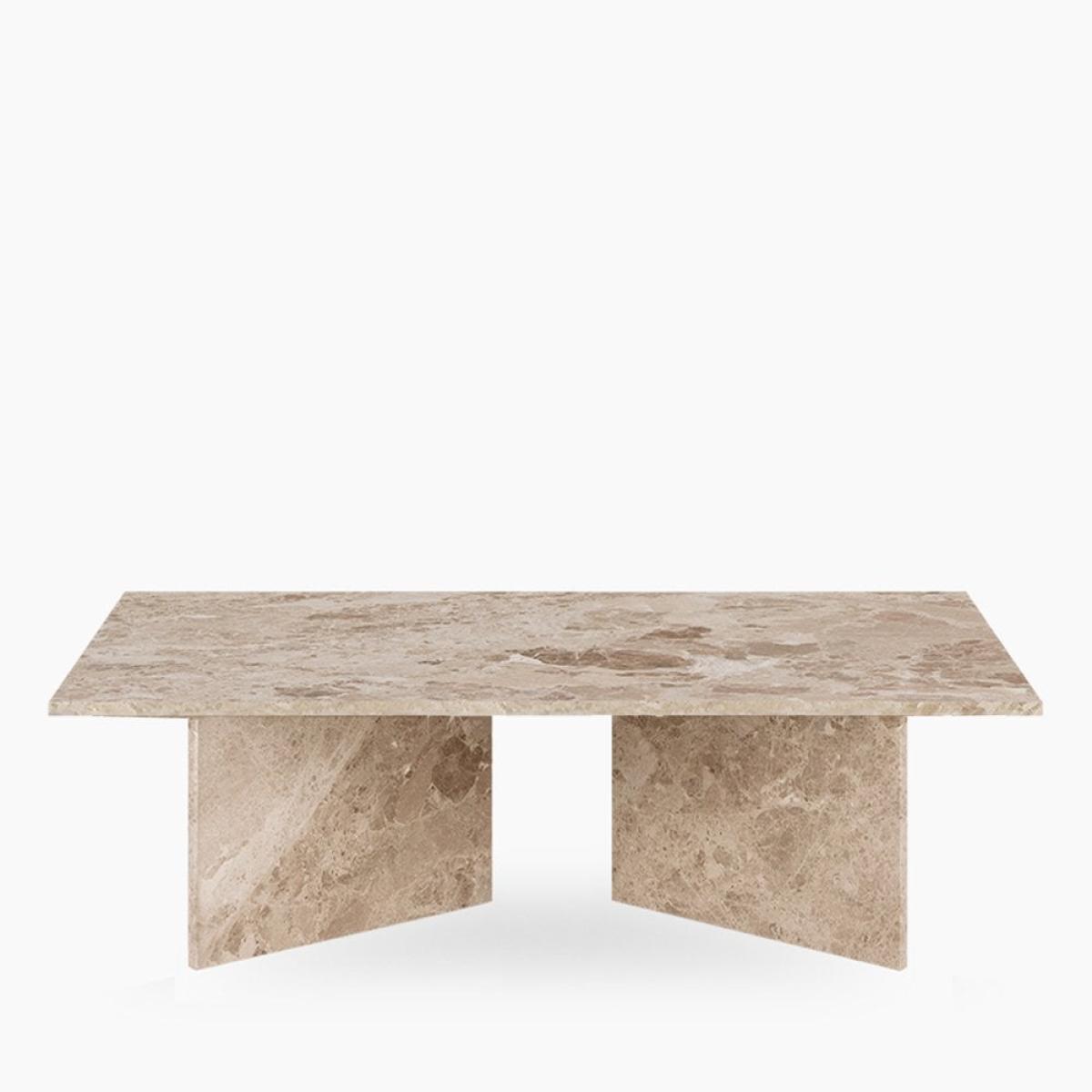 The Vega Marble Coffee Table is inspired by post-modernist minimalism. This playful composition of geometric shapes brings style straight into your living room. With a rectangular tabletop, the legs divide out into a pleasing symmetrical design, and its this linking of shapes that help reinforce its durability. In a light latte brown marble, each table has its own unique veining, and the hue just adds to its luxurious feel. This product is handcrafted from natural European marble, making each piece unique with naturally occurring texture, pattern, and colour. These variations should be seen as part of the beauty of the design that makes this a truly one-of-a-kind piece.