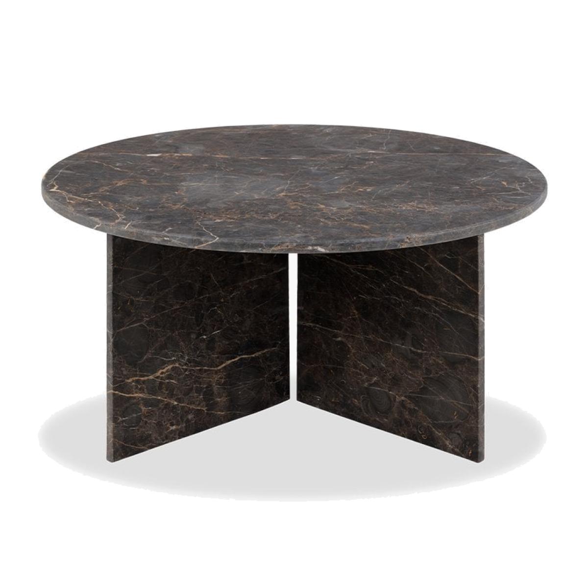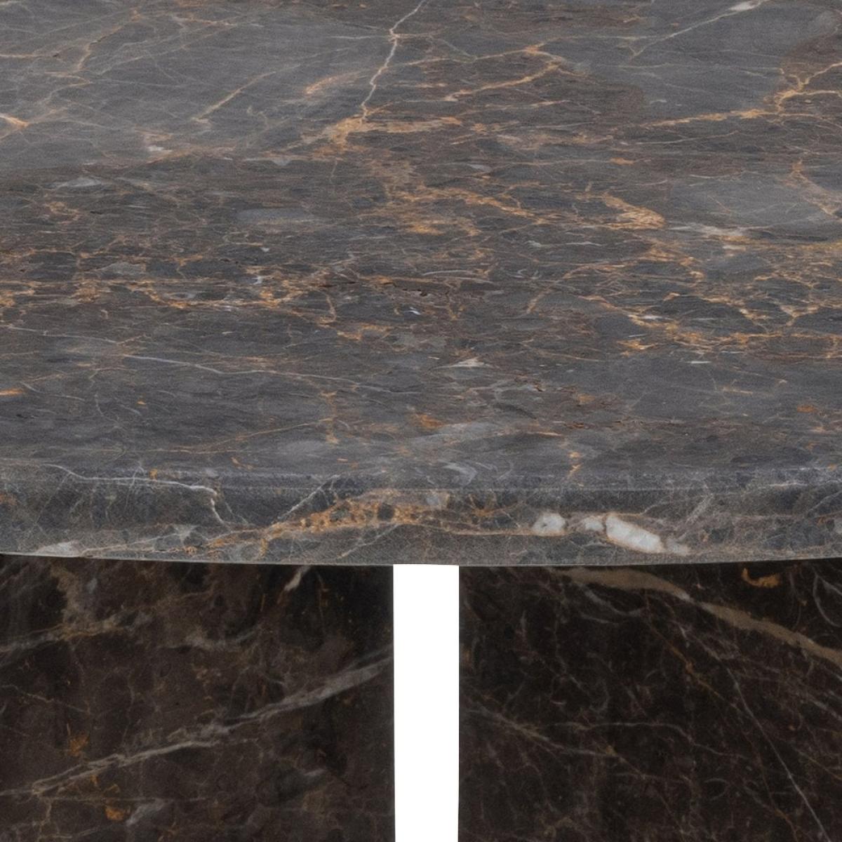 The Vega Marble Coffee Table is inspired by post-modernist minimalism. This playful composition of geometric shapes brings style straight into your living room. This round coffee table is long-lasting with its linking of shapes reinforcing its durability. In a rich storm grey grey marble with brown veining, each table has its own unique veining, and the hue just adds to its luxurious feel. This product is handcrafted from natural European marble, making each piece unique with naturally occurring texture, pattern, and colour. These variations should be seen as part of the beauty of the design that makes this a truly one-of-a-kind piece.