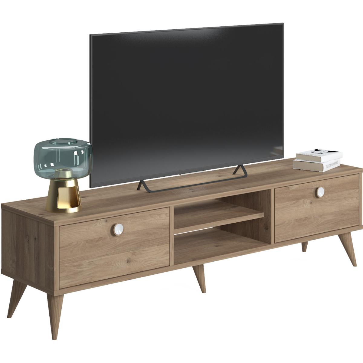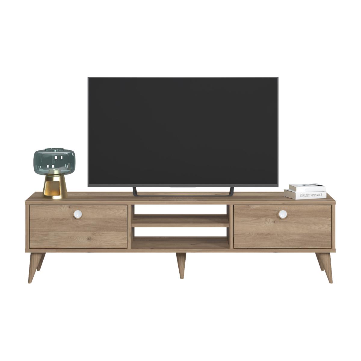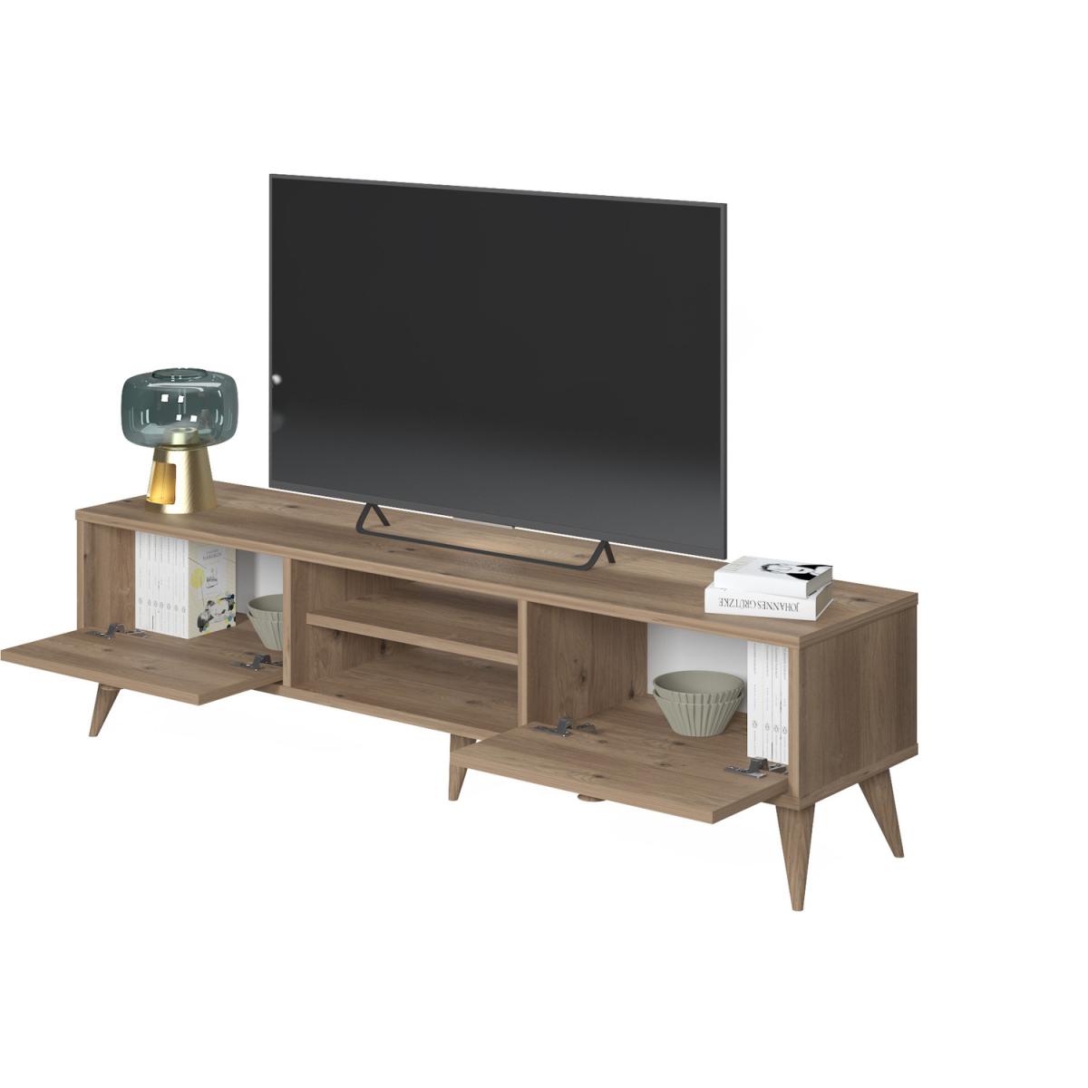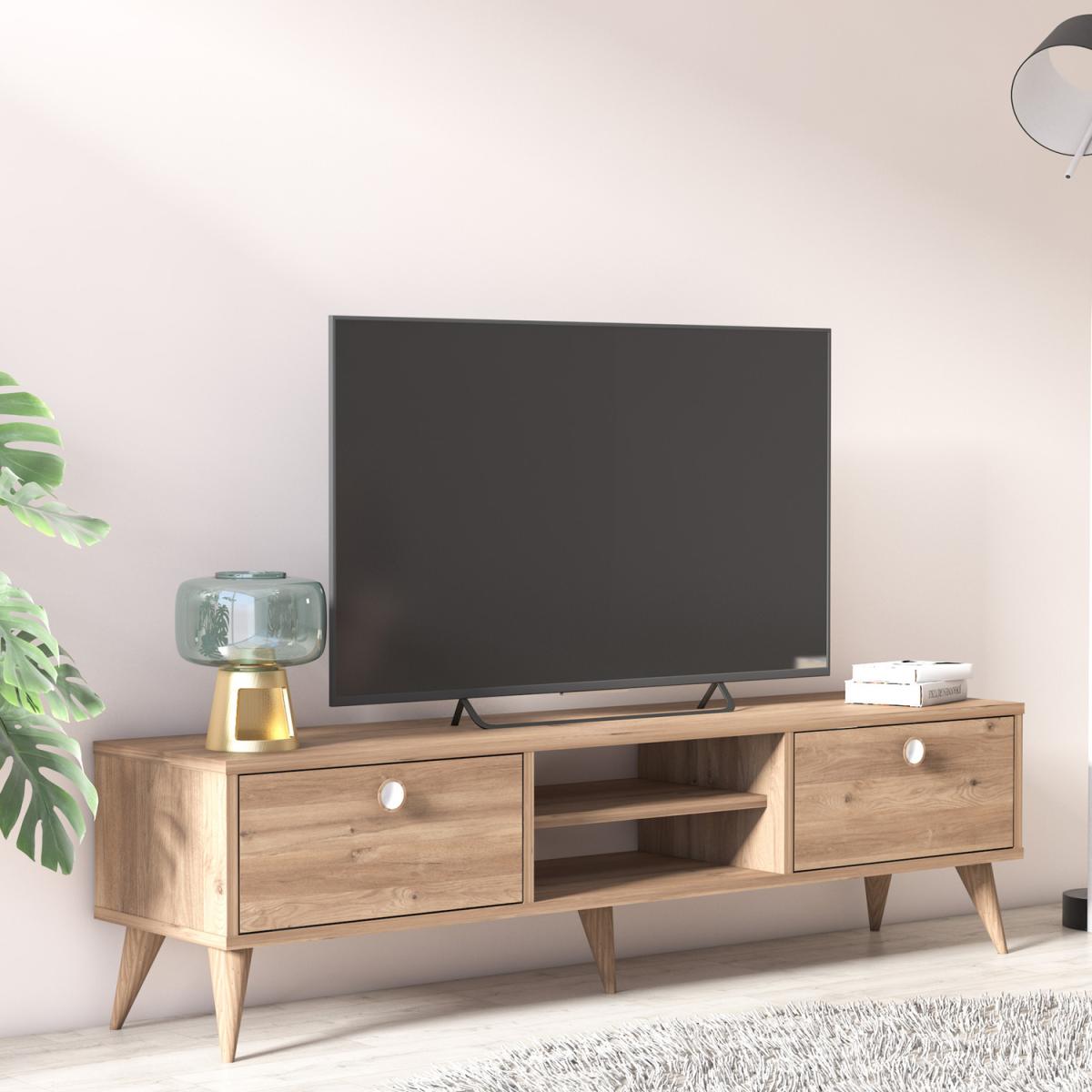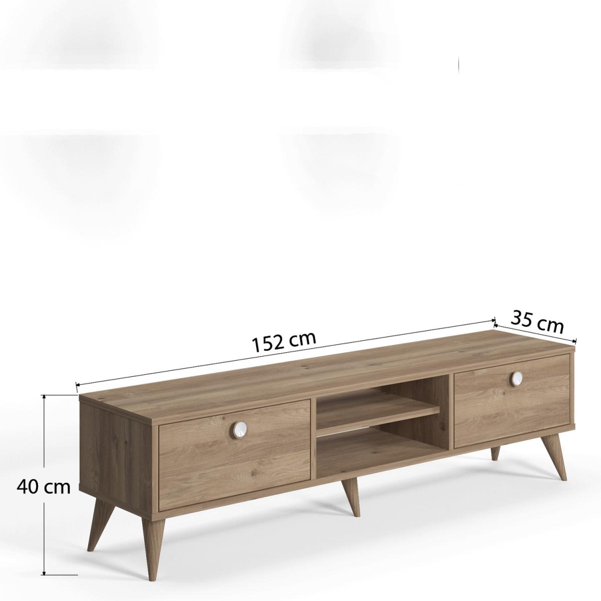 Ruumstore Vega TV Stand 59'' width with 2 functional flip doors and 2 open shelves. Very easy to assemble with minimum tools Vega TV unit, which creates an extra storage area with its lid cabinets and shelves in the middle, attracts attention with its stylish design. With its design that will double your pleasure to watch TV, Vega TV unit adds a stylish touch to your decoration. This TV unit, which also provides ease of cleaning with its high -foot structure, also has the ability to combine with the entire Soho collection. You can combine it with other Vega items to create a whole look in your home!Stylish with efficient storage A simple retro style bookcase suitable with the tall angled legs and different sized shelves. It provides a functional storage space according to your needs. The legs give a light airy look and make it easy to clean the floor underneath. Customer assembly required Our products have been shrinked on both sides as internally and externally to prevent the damages. All the packages have been quality tested. Accessories in the product images are for decoration purposes and are not included in the price.