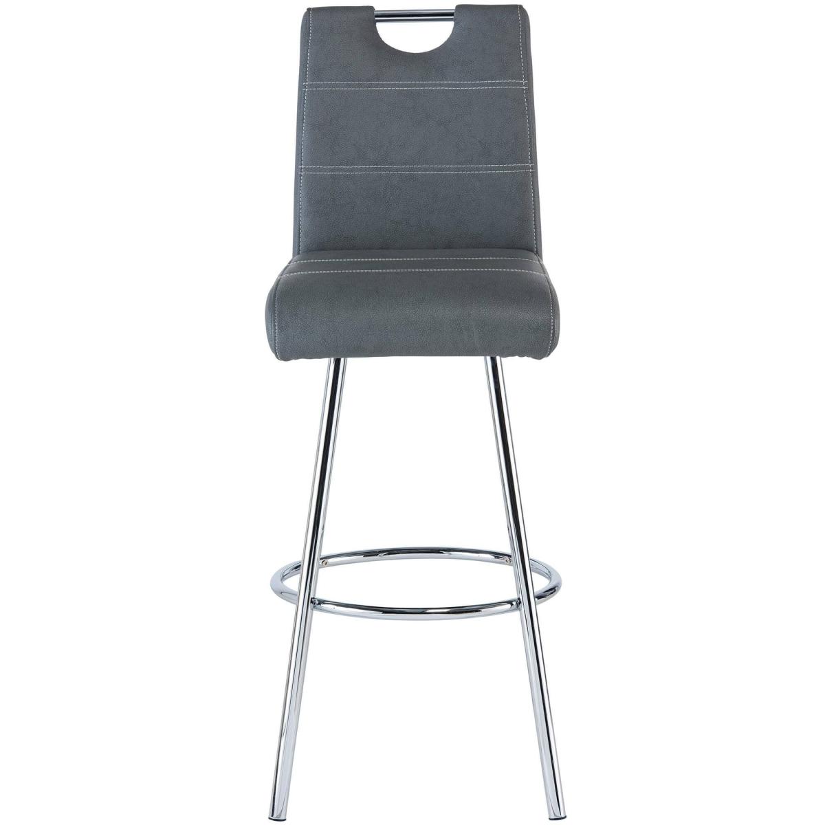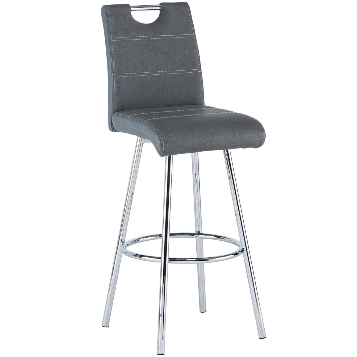 Modern grey bar stool. A stylish addition to any residential or commercial premises, this bar stool is part of the Vegas range from World Furniture. Boasting polished chrome legs with a circular footrest in the centre, it comes complete with a grey, faux leather, padded seat with chrome detailing at the top. It is perfect for use in kitchens, dining rooms and bar areas.