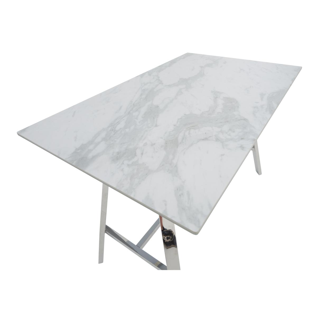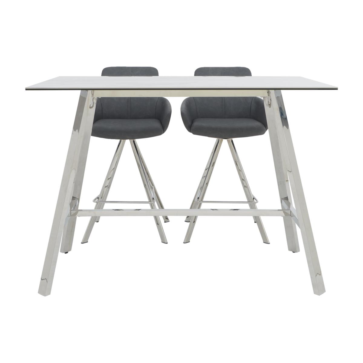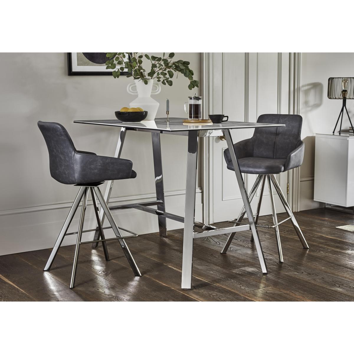 The gorgeous marble-effect ceramic and polished stainless steel of the Vegas range epitomises modern glamour. This stunning range instantly brings a touch of class to any interior, and with a range of furniture to choose from you can enjoy its timeless beauty throughout your home. From dinner party-ready dining sets to a wonderfully stylish yet practical shelving unit, this range is both beautiful and sturdy. The extending dining table steals the show, seating up to 10 people when fully extended, perfect for hosting in comfort and style. This gorgeous range is exclusive to Furniture Village. Looking to add a touch of glam to your home? This stunning bar table set will do the trick, with marble-effect ceramic and polished stainless steel to really elevate your interior. Why you'll love it. A modern bar table set to give your interior an on-trend refresh. Contemporary glamorous style. Stunning yet durable marble-effect ceramic top. Polished stainless-steel legs. Due to the nature of the ceramic, every piece is entirely unique. Set includes 2 swivel barstools. Barstools are upholstered in sleek dark grey faux leather. Stylish stitched detailing. Swivel base with polished stainless steel legs. Exclusively at Furniture Village. This bar table set is part of the Vegas range. What you need to know. Ceramic is highly durable, and heat-, scratch- and chip-resistant. Each ceramic top is individually made and will have unique and distinctive characteristics. Bar stools are cushioned with foam for comfortable dining. Steel frame and legs. Love this style? You’ll love the Vegas extending dining table.