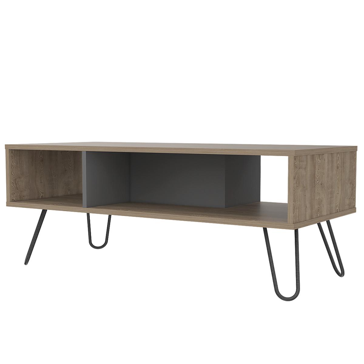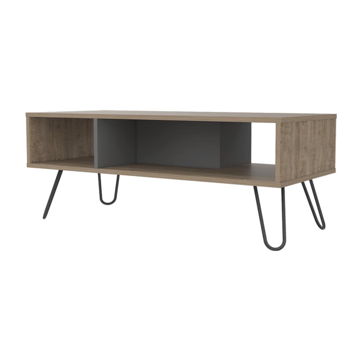 Our contemporary styled coffee table is made from hardwearing melamine board, finished with a bleached oak effect and contrasting grey effect and black metal hair pin shape legs