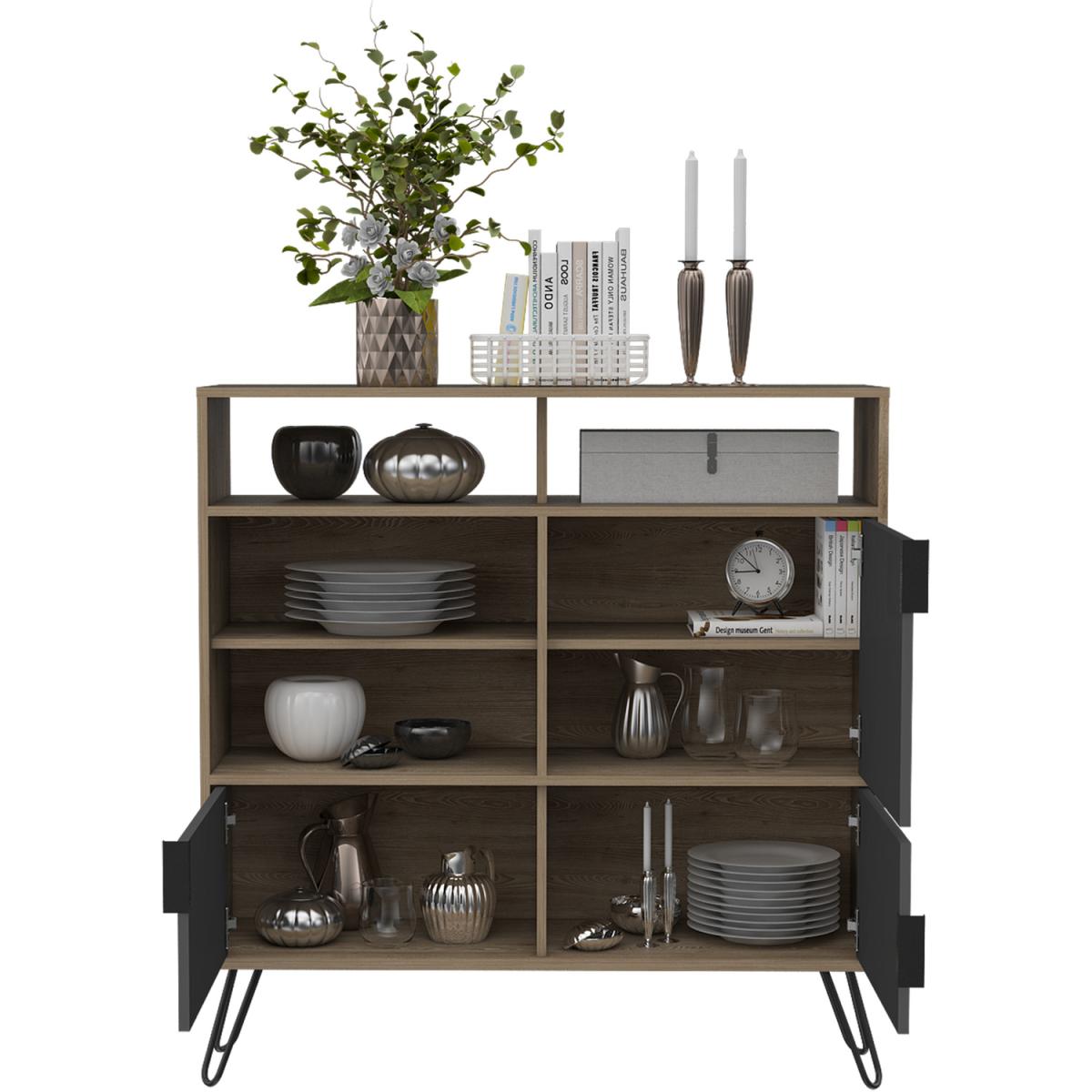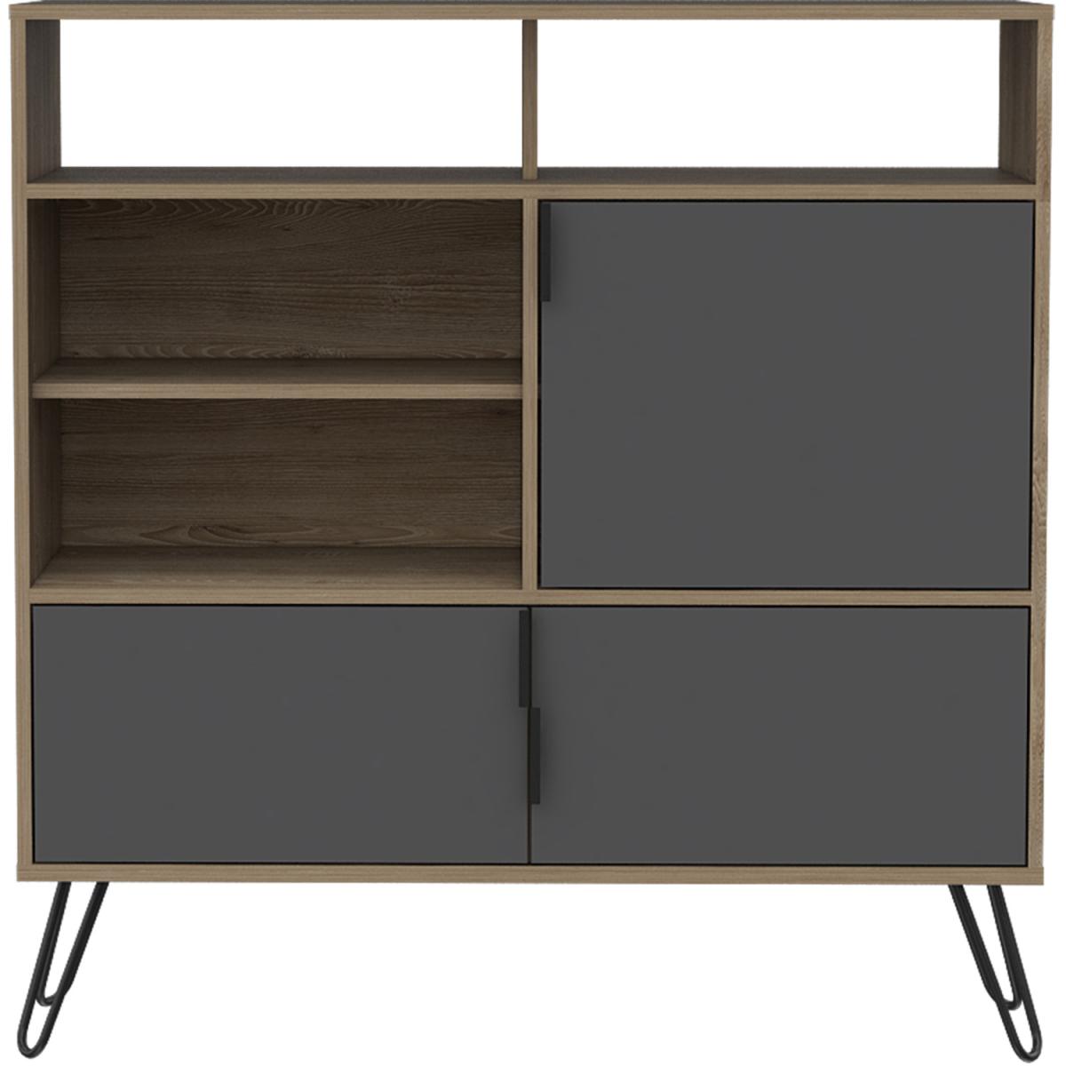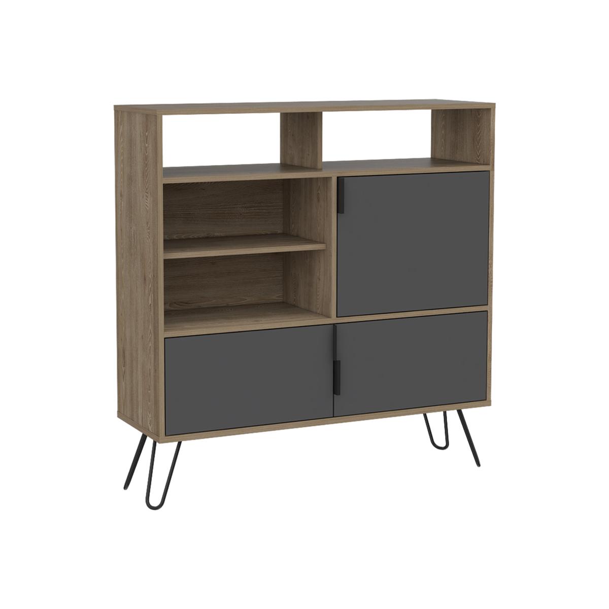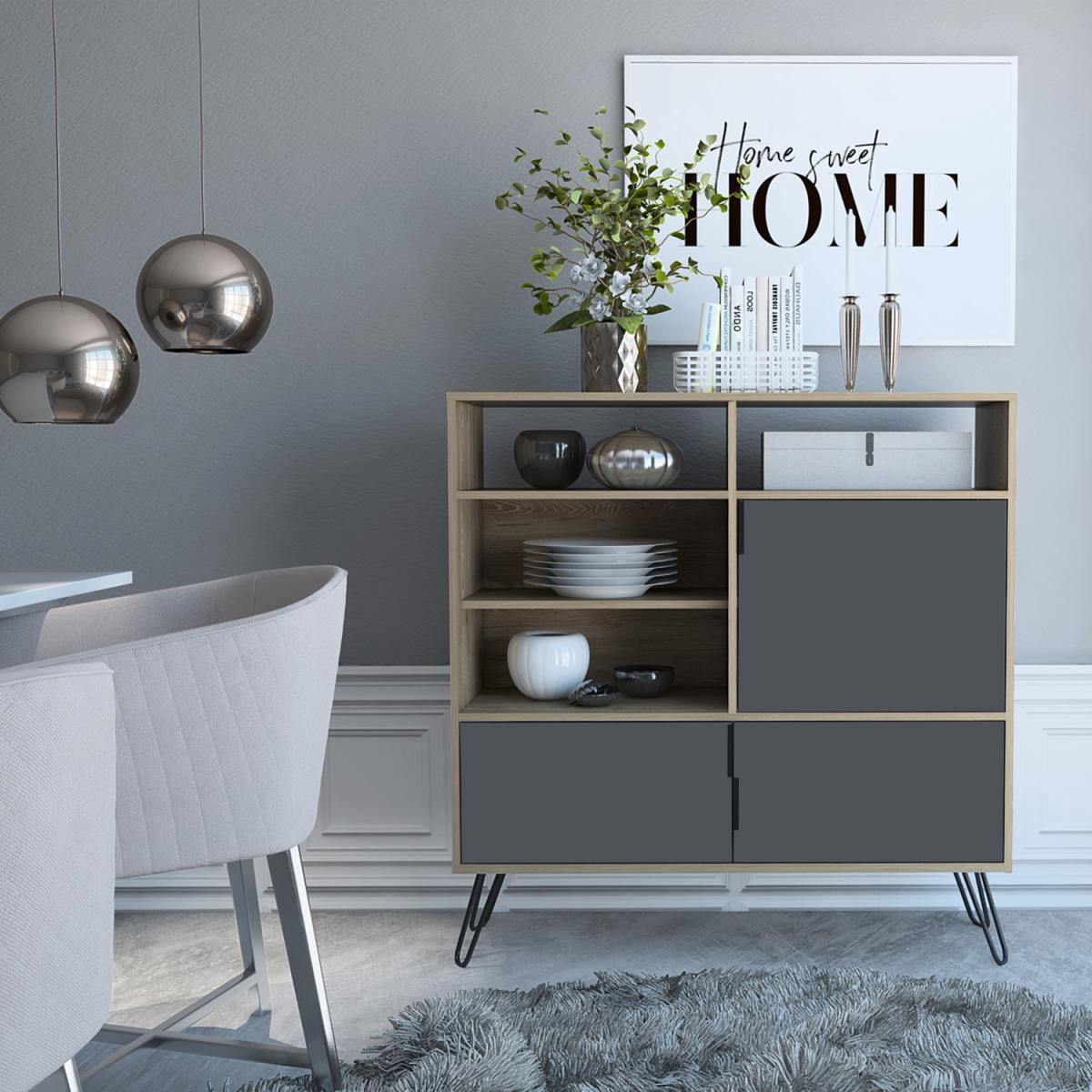 The Vegas collection brings you stylish, innovative designs, ideal for todays casual lifestyle. Each piece is designed to serve a practical purpose and can be used individually or combined with other pieces from our Vegas range for a fully coordinated look. Made from hardwearing manufactured wood boards with an easy to clean finish, a bleached oak woodgrain effect is used for the cabinets with a contrasting grey for the fronts. The industrial feel is further accented with real metal black painted grip handles and hairpin legs. If you need to optimise storage space in your dining area, this high sideboard offers you a lot more storage than a standard sideboard. The top section offers plenty of display space and the inspiring combination of open and enclosed storage of different sizes is really useful. Inside the large cupboard you will also find a rigid shelf.